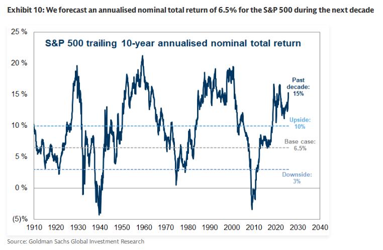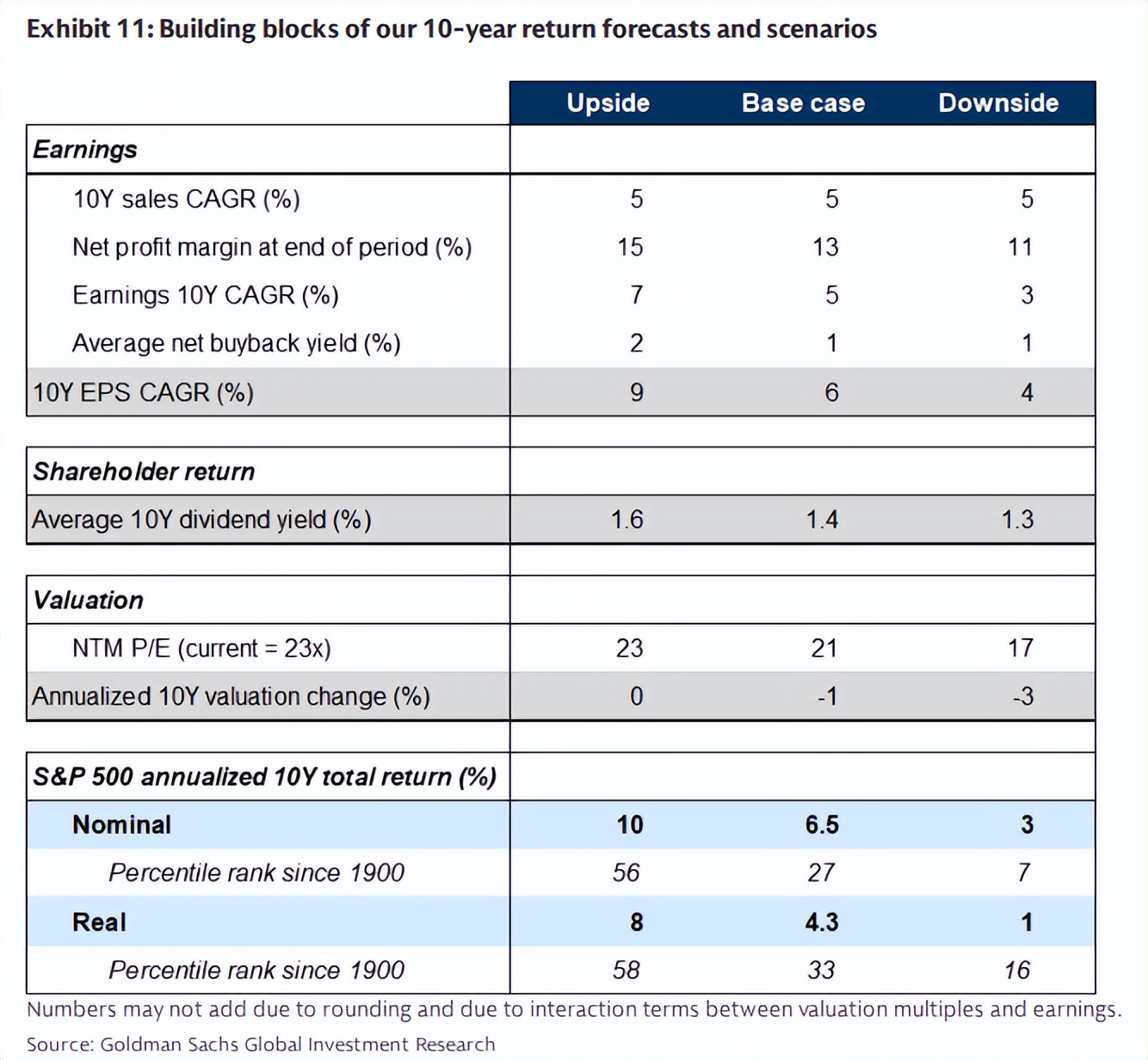 估值:每年下降1个百分点。估值起始于约19倍预期收益的高位(见图表6),高盛假设未来十年估值将略有下降。实际上,这意味着未来十年收益累计增长将超过股价约10%(估值每年下降约1个百分点),考虑到初始市盈率,这是一个较为保守的估计。