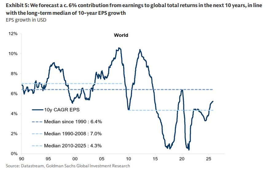 (2)盈利增长仍然是业绩的主要驱动力,高盛预计全球盈利(包括股票回购的影响)将以每年约6%的复合增长率增长。
