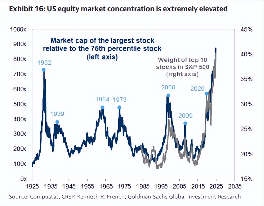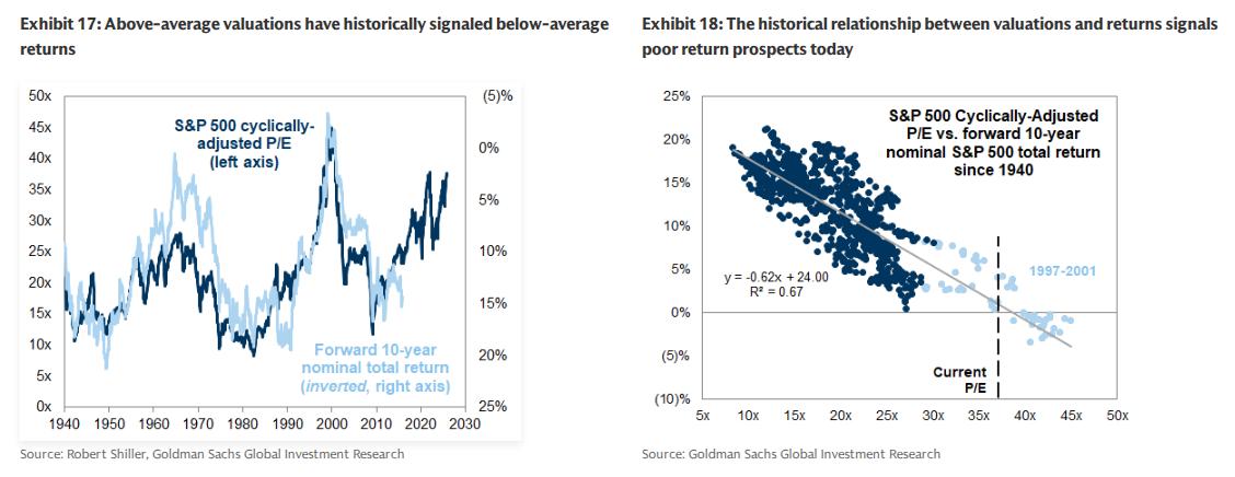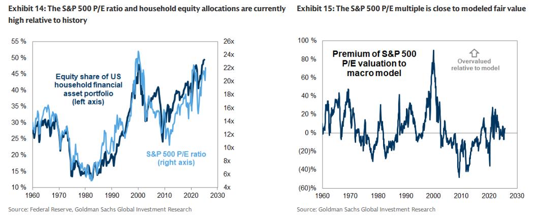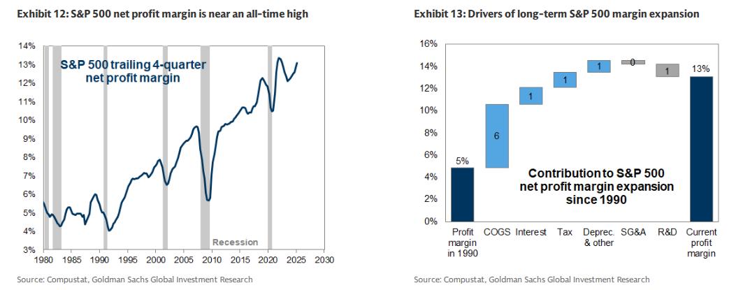 然而,估值并非全部。虽然较高的市盈率通常预示着较低的预期回报,但高盛认为,目前的估值在一定程度上可以由结构性更高的利润率和更高的净资产收益率来解释。这些因素反映了指数构成的变化和持续的效率提升,从而降低了仅凭CAPE指标预测的个位数回报率的风险。换句话说,估值仍然是一个不利因素,但它并没有主导前景。