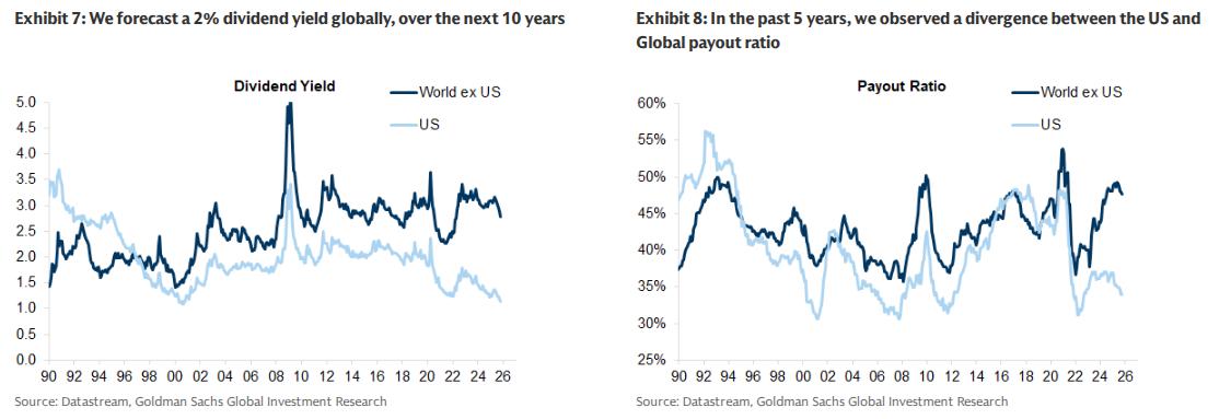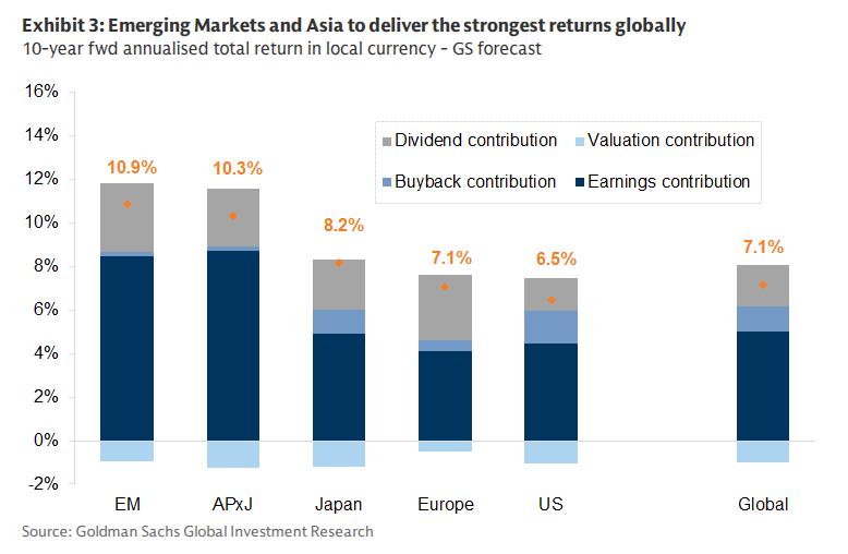 盈利增长仍然是业绩的主要驱动力。高盛预计全球盈利(包括股票回购)的年复合增长率约为6%。股息贡献了剩余的回报,同时高盛预计估值将从目前的高位略有回落。