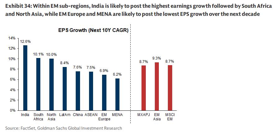新兴市场:高盛预计年化收益率为 +10.9%,主要受强劲的每股收益 (EPS) 增长驱动,尤其是来自中国和印度的增长。高盛还看到,在政策改革的支持下,股东回报正在改善。