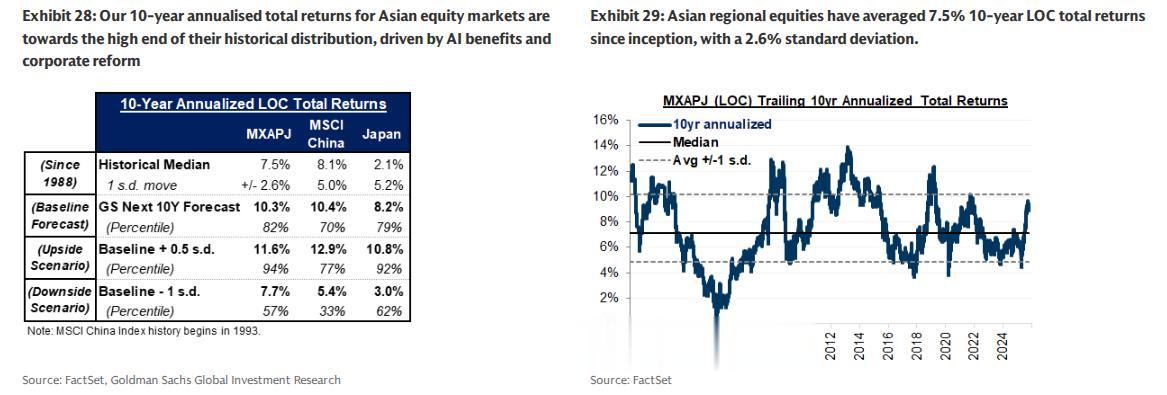 除日本以外的亚洲:高盛预计年化收益率为+10.3%,主要得益于每股收益 (EPS) 增长约9%(以当地货币计价)和2.7%的股息收益率,但部分被估值下调所抵消。