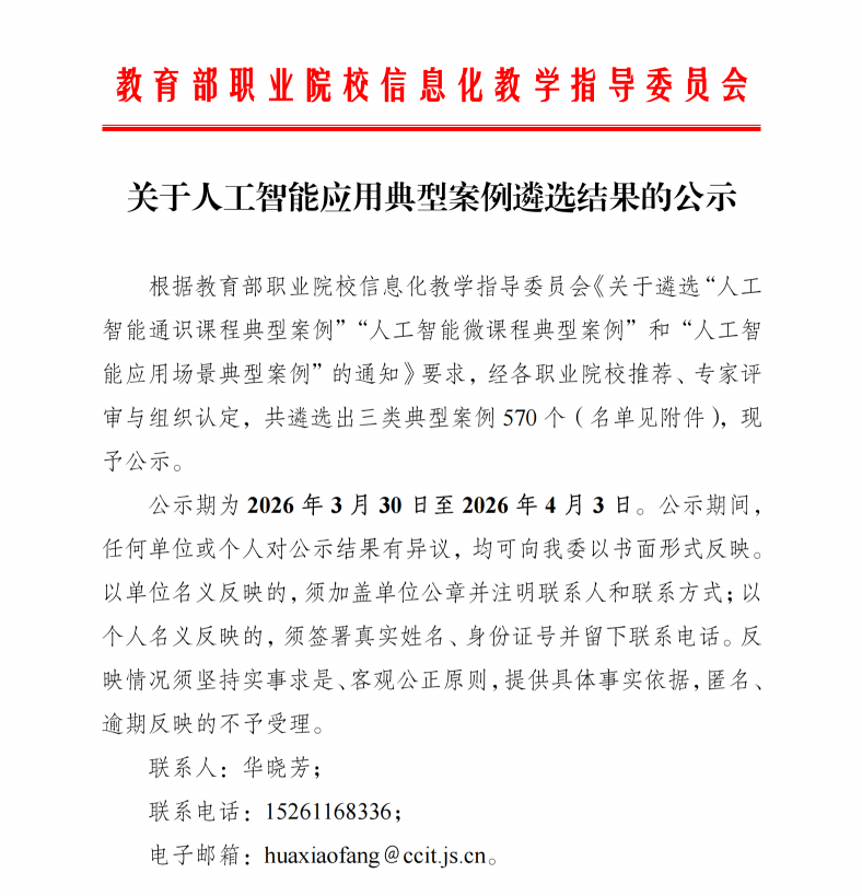学校将以此次获奖为契机,充分发挥典型案例的示范引领作用,进一步深化人工智能与各专业群的融合创新,持续优化课程体系、升级教学资源、创新育人模式,全面提升师生人工智能素养与技术应用能力,为培养适应数智时代需求的高素质技术技能人才、服务职业教育高质量发展贡献更大力量。