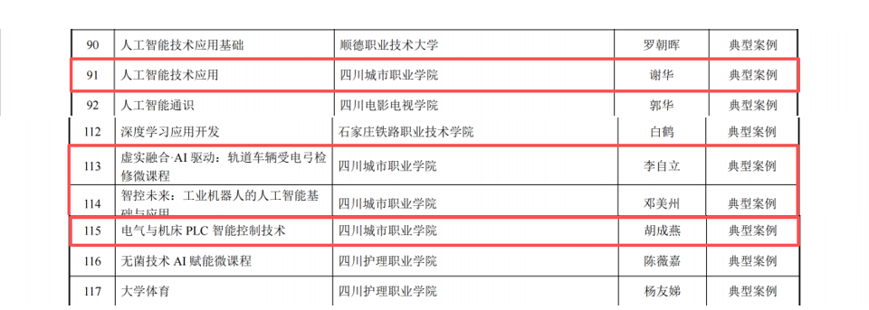 近日,教育部职业院校信息化教学指导委员会公布了人工智能应用典型案例遴选结果公示,四川城市职业学院共4个作品荣获典型案例荣誉称号,其中1项人工智能通识课程典型案例、3项人工智能微课程典型案例,获奖数量在全国参赛高职院校中名列前茅,彰显了学校在人工智能教育教学改革与实践领域的领先实力。