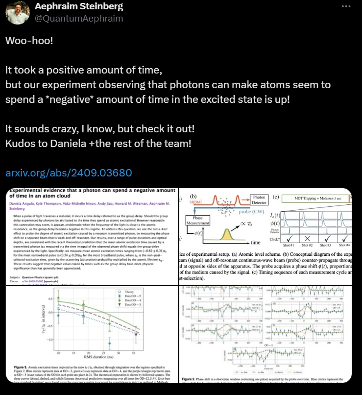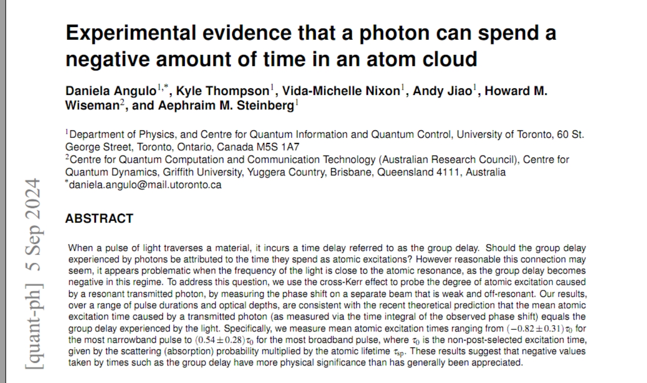 多伦多大学的物理学家艾弗拉希姆·斯坦伯格在社交媒体平台X上发布了关于这项新研究的帖子,他提到:“光子消耗了正的时间,但我们的实验观察到光子可以让原子在激发态中显得消耗了负时间!”该研究于9月5日上传至预印本服务器arXiv.org,目前尚未经过同行评审。