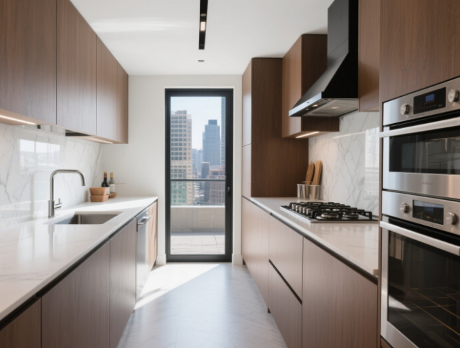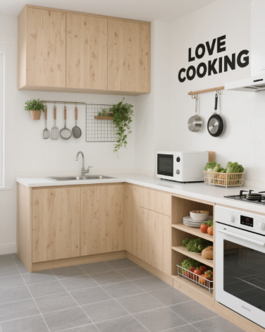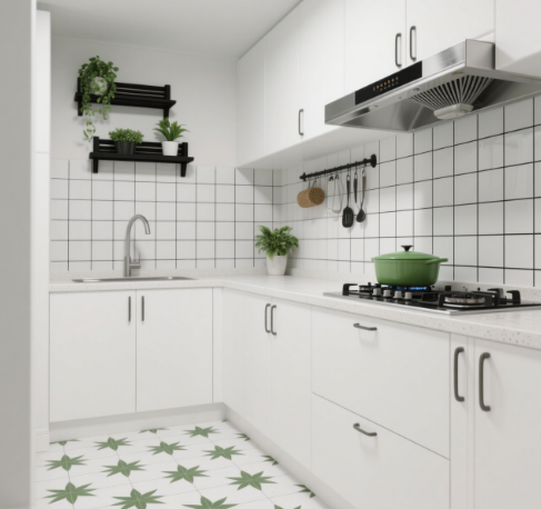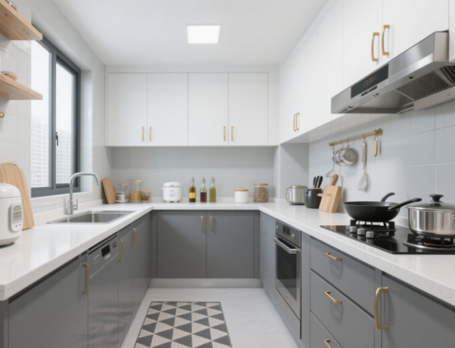 若想在厨房施工完成后就能安装上橱柜,那一定要早点定好板材、样式、尺寸等,这样工厂可以提前制作。