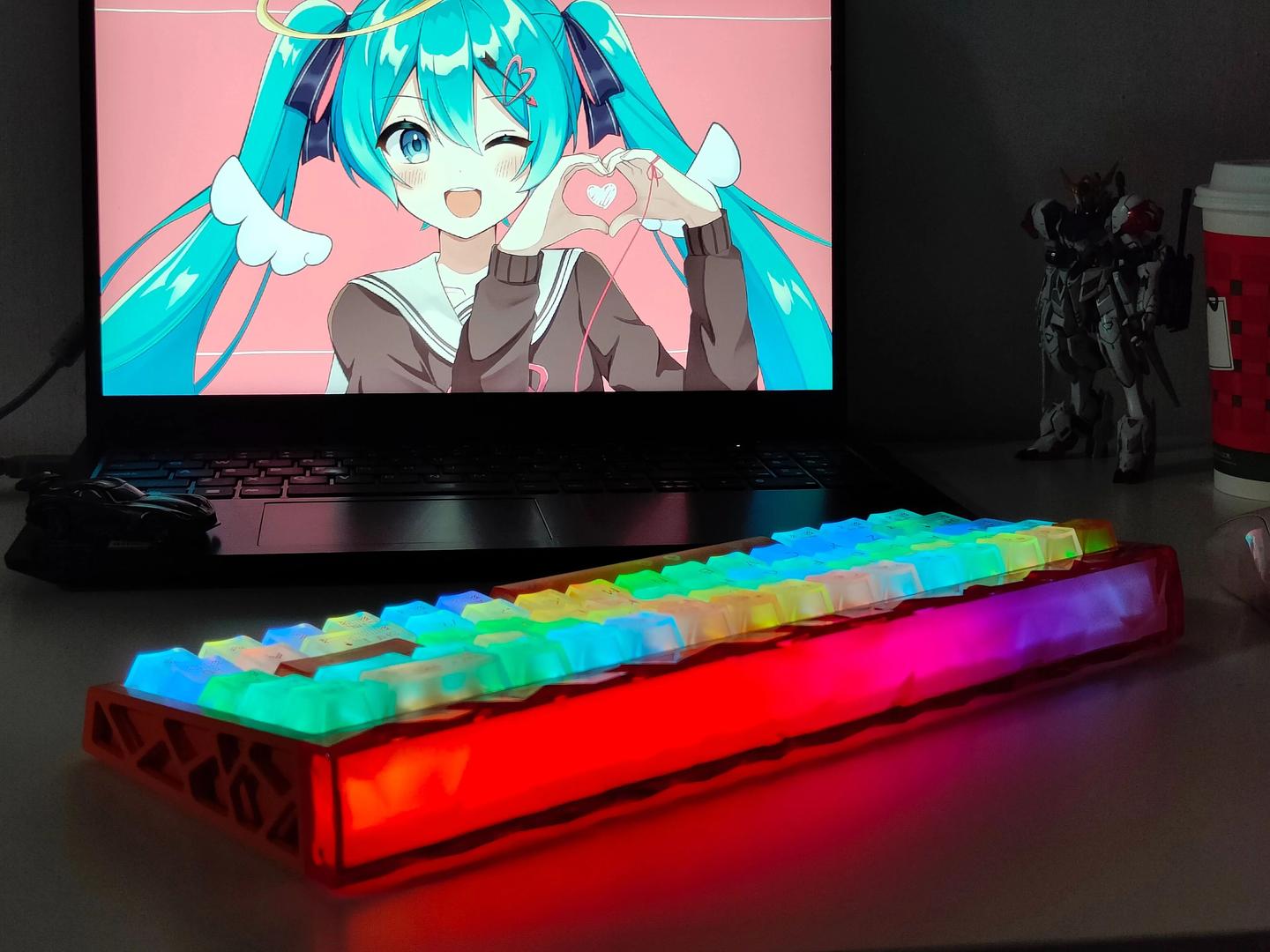 官方“赛博镂空设计 + 一体式全封闭堡垒结构”真不是噱头,机身镂空线条利落又有力量感,拿在手里能感受到扎实的用料和做工。靠着镂空设计打破了传统键盘的沉闷感,往桌面一放,直接就是整个桌搭的视觉核心。