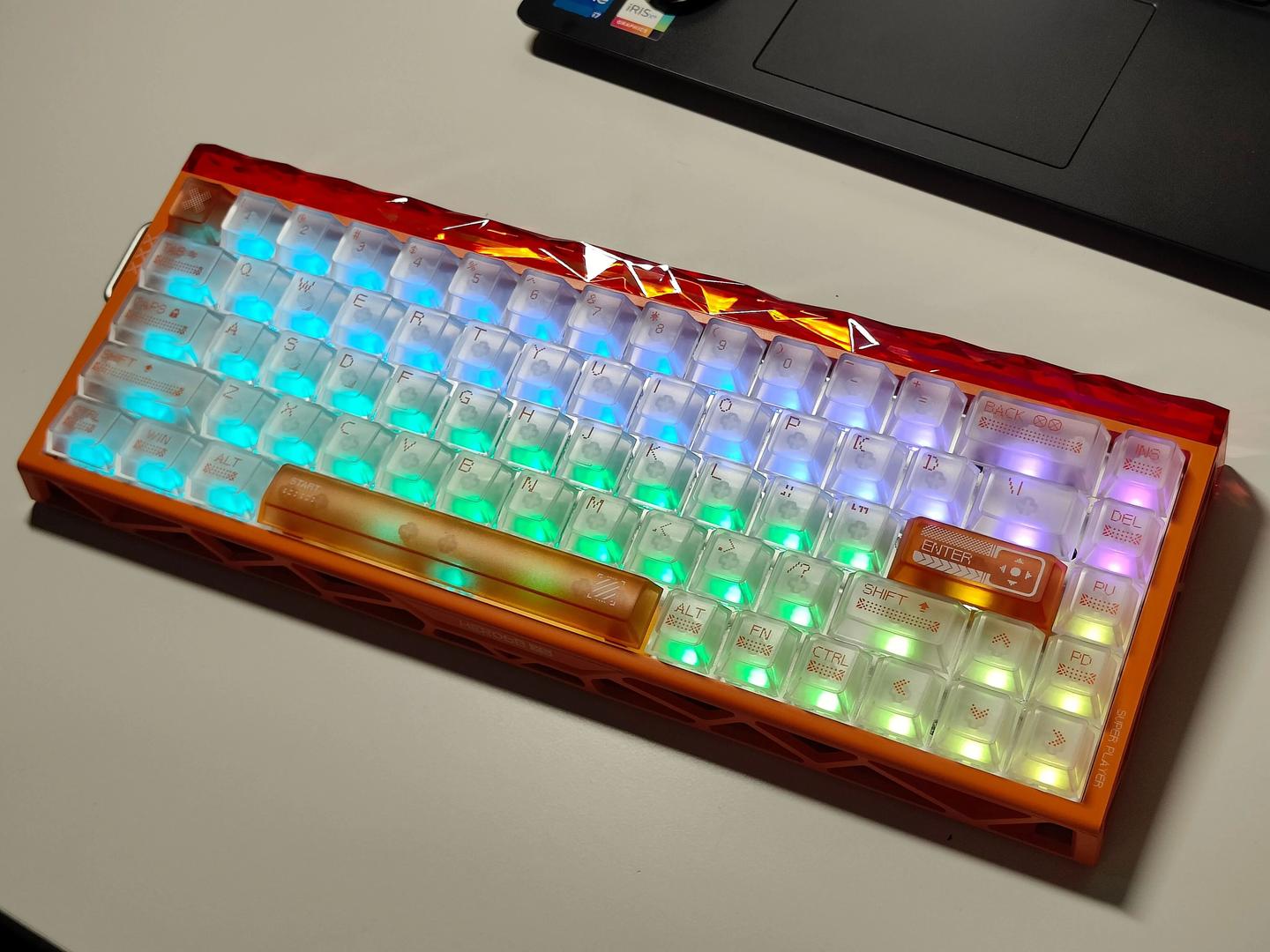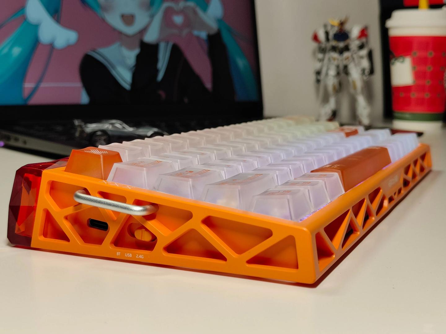 开箱第一眼,最吸引我目光的就是键盘外观设计。幻影橙配色搭配橙透灯箱,和市面上常见的键盘直接拉开了差距。