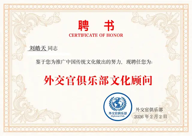 作为深耕文化传播的青年代表,刘皓天始终以笔墨为媒,积极搭建中外文明对话的桥梁。2024年,他参与外交官系列文化活动,凭借书画艺术与跨文化沟通的双重能力,获评“书画小小翻译官”;2025年1月,在“中国-东盟国际文化交流系列活动”中表现亮眼,获颁“国际交流使者”称号,成为青年一代文化传播的典范;同年5月,受邀出席马里驻华大使馆“青年外交官特别活动”,以书法为纽带深化中外民间友好;其参演的书画节目在国家国际教育电视台《闪耀中国》栏目“2025新春大联欢”中斩获金奖,用艺术表现力传递中华美学魅力。此外,他积极参与重大主题文化活动,参展抗战八十周年主题展览并获评“青年优秀作品”,代表作《德艺双馨》被牛津大学收藏、《博览群书》被剑桥博物馆纳入馆藏,让华派书法在国际学术与文化殿堂绽放光彩。