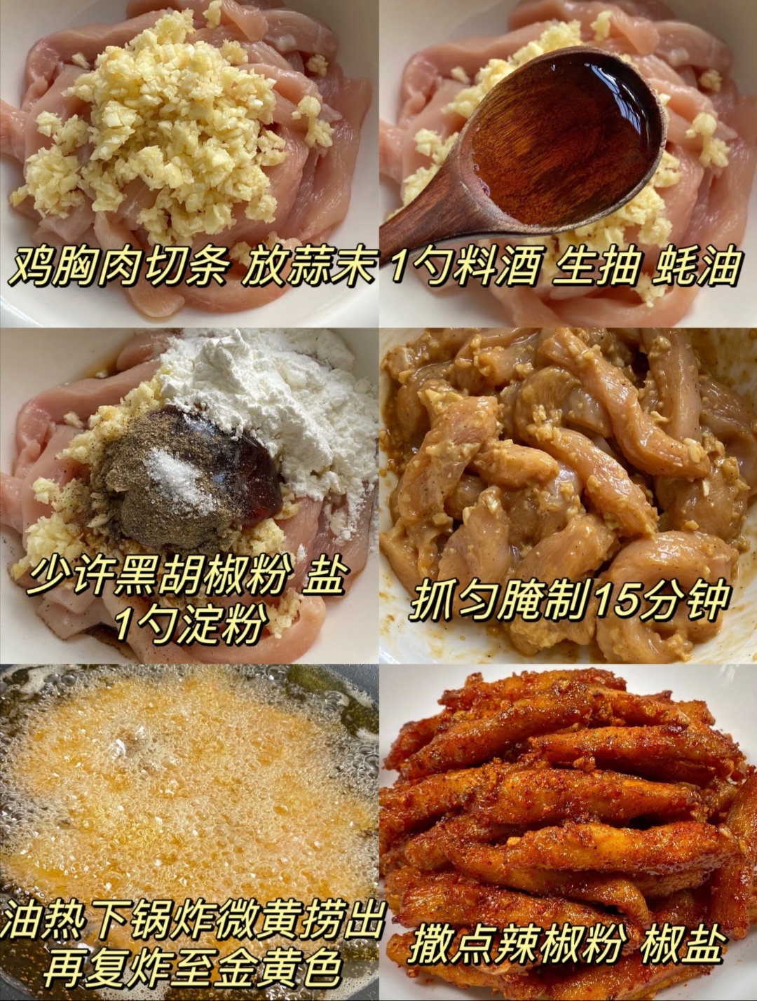 如果你实在来不及,也有速成法:鸡柳切好后,直接用蒜末+盐+黑胡椒+淀粉抓匀,其他调料都不放,炸出来撒椒盐,味道一样杠杠的!不过我个人还是推荐完整版,层次更丰富~