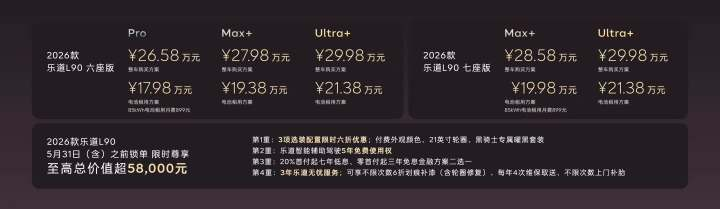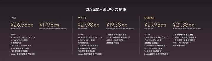 2026款乐道L90提供六座/七座两种座椅布局,Pro、Max+和Ultra+三个版型。其中,六座Pro版标配85kWh长续航电池包、超大行程智能空气悬架和Nappa真皮主题豪华内饰套装,指导价26.58万元起,BaaS电池租用方式购买,车价立减8.6万元,指导价仅需17.98万元起。Pro版将继续搭载英伟达Orin X芯片,并采用纯视觉智驾方案。预计今年7月,纯视觉版本将迎来一次大的迭代升级。