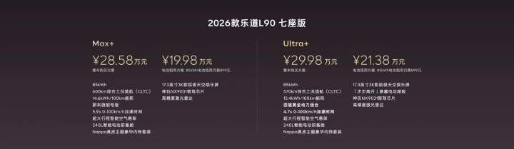 七座提供Max+和Ultra+两种版型,整车购买价分别是28.58万元和29.98万元起,电池租用方案购买为19.98万元和21.38万元起。
