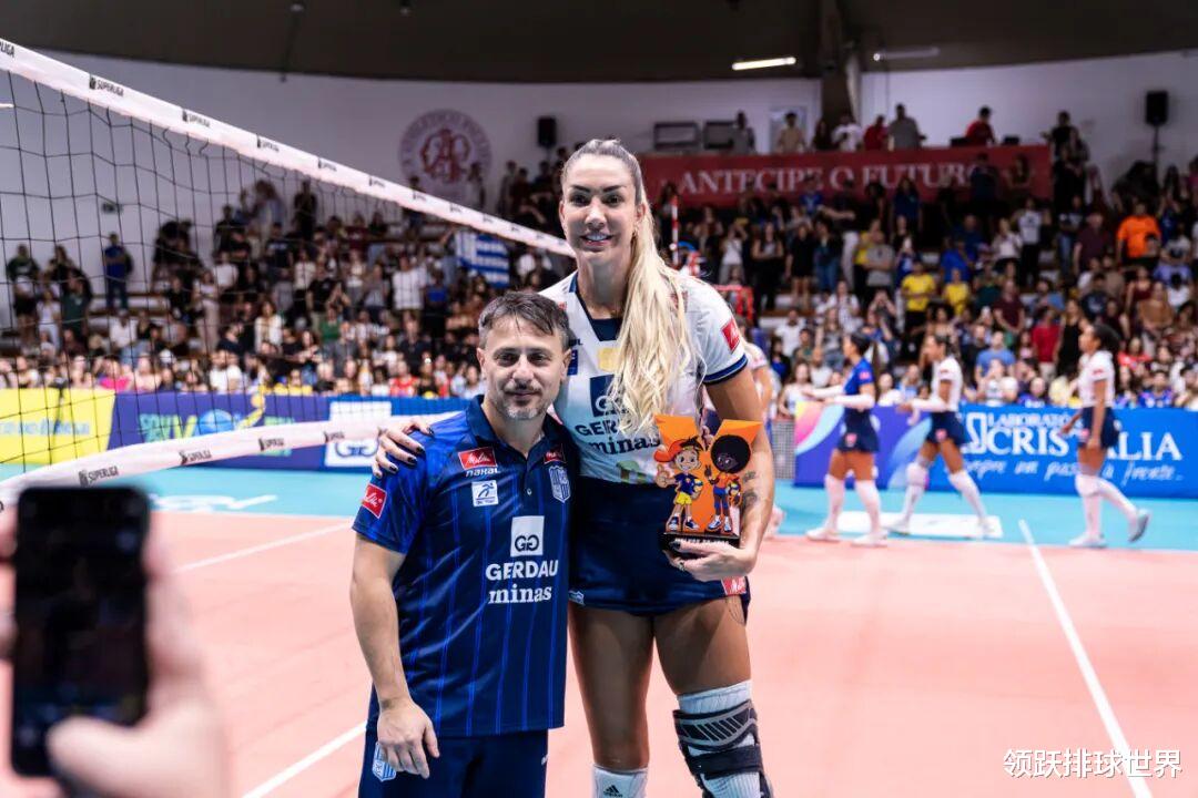 而本场比赛最大的焦点,无疑是38岁老将、“奶塔”塔伊萨(Thaísa Menezes)的惊艳表现,身为副攻的她本场比赛直接打出主攻的效果,全场狂砍22分(29扣17中4拦1发),进攻成功率高达59%,不仅多次在关键分发起强攻,还以老将经验稳定军心,为米纳斯争得宝贵胜利,同时斩获MVP奖项。