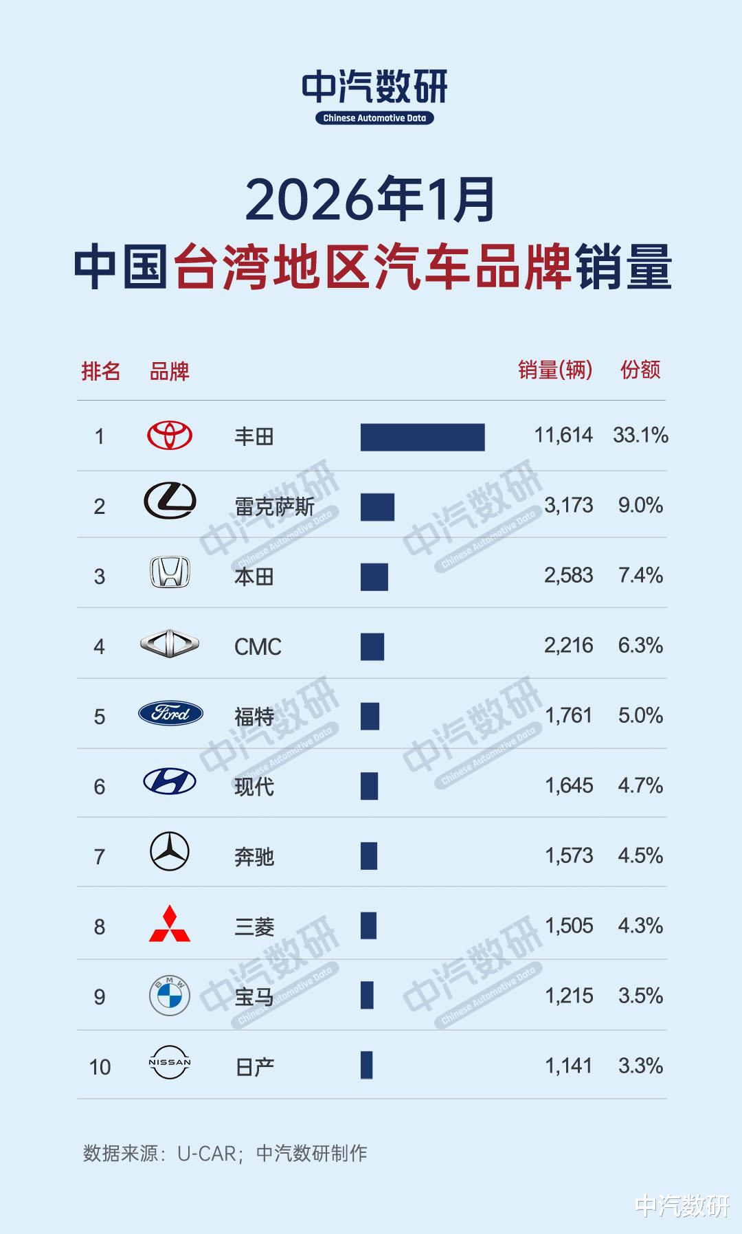 2026年1月,中国湾车市延续了近年来的品牌格局,日系品牌依旧占据绝对主导地位,细分车型市场则呈现出多元化竞争态势。