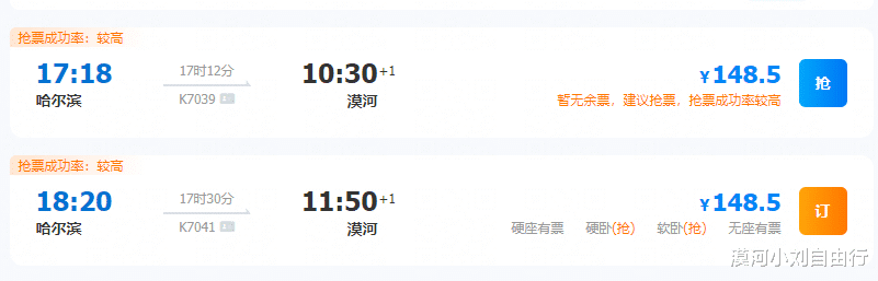 定好闹钟:K7041是哈尔滨→漠河早上10点放票,K7039是绥化→漠河15:30放票(绥化是始发站,订票成功lv高,可哈尔滨上车),提前5分钟闹钟响