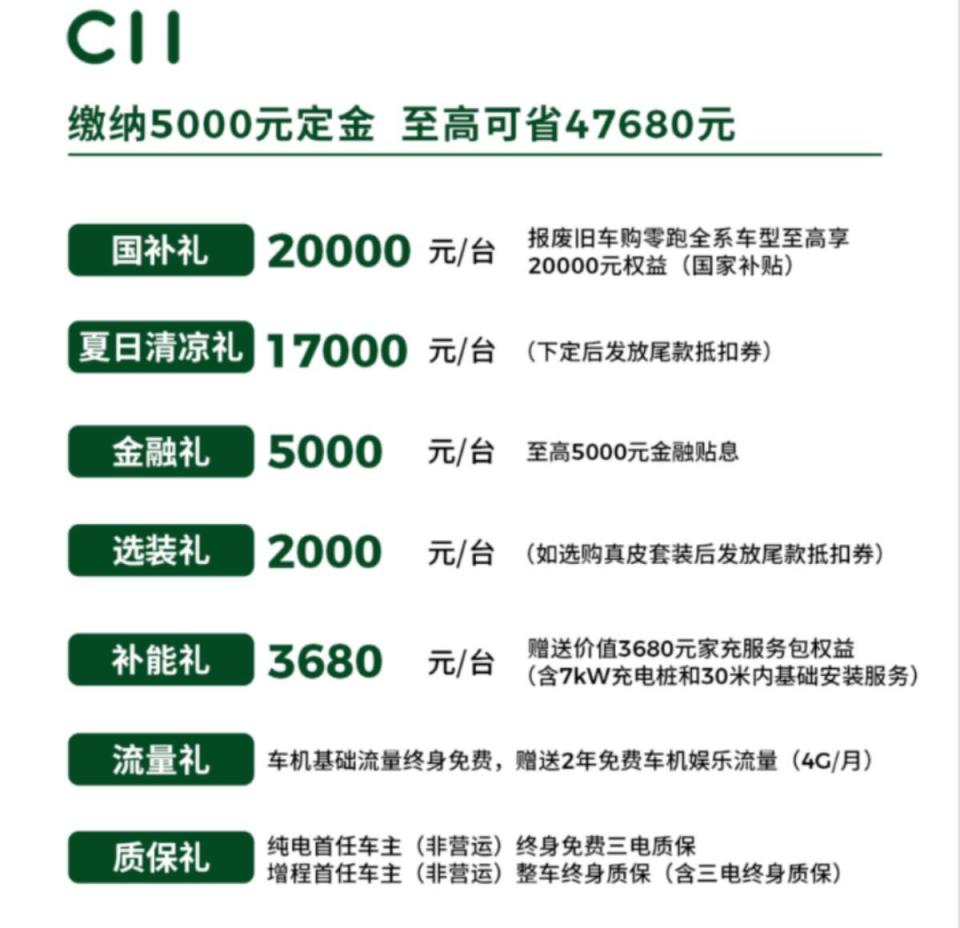 不得不说,零跑这个品牌逆袭的爽文确实精彩,前几年很多人并不看好零跑,而现在的零跑已经用自己的销量狠狠打脸,甚至走到了理想前面。而且综合零跑旗下车型的产品力和价格来看,显然零跑汽车更适合追求品价比的消费者,就拿零跑C11来说,目前进入5月份后,零跑官方推出了巨大的限时优惠政策,比如至高享20000元权益(国家补贴)、17000元下定后尾款抵扣券、至高5000元金融贴息、3680元家充服务包权益等等,目前很多经销商给到零跑C11的报价限时低至10.68万起,品价比非常高。