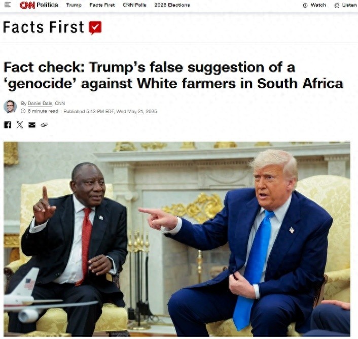 这场争执也引起了国际社会的广泛关注,美媒CNN调查之后火速发布了一篇名为《事实核查:特朗普关于南非白人农场主遭受“种族灭绝”的虚假说法》,并明确表示,南非的确存在暴力犯罪,但并不存在所谓的“种族灭绝”行为,这是毫无疑问的假消息。