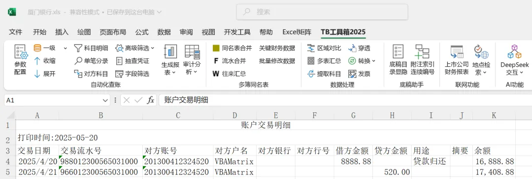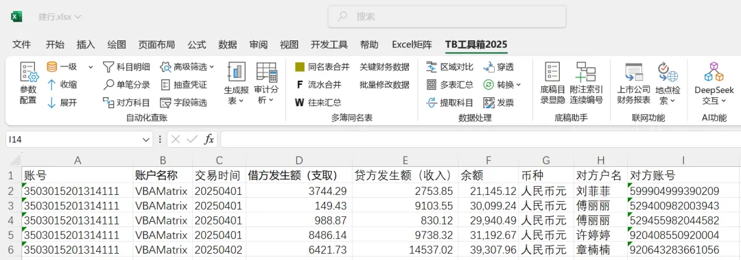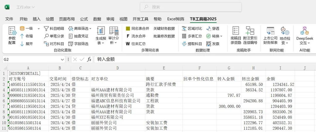 操作指引我们在“TB工具箱”功能区下,点击“流水合并”。在弹出文件夹选择对话框,我们选择银行流水所在的目录,即可将所有的流水文件按标准字段汇总输出到新工作表上。最终汇总效果如下图所示: