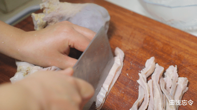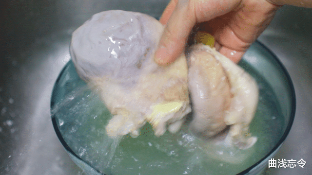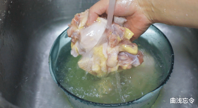 6、处理鸡块:趁炖煮猪肚的同时处理鸡肉,鸡肉剁成鸡块,清洗干净,清水中加入适量姜片、葱结、料酒,抓揉出汁,浸泡30分钟左右,去除血水杂质和去腥。(也可以用焯水的方式)