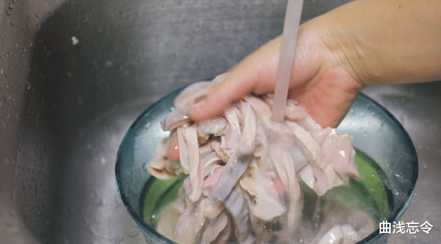 3、二次清洗:捞出猪肚,用热水清洗干净。切成长条,再次用热水清洗干净。