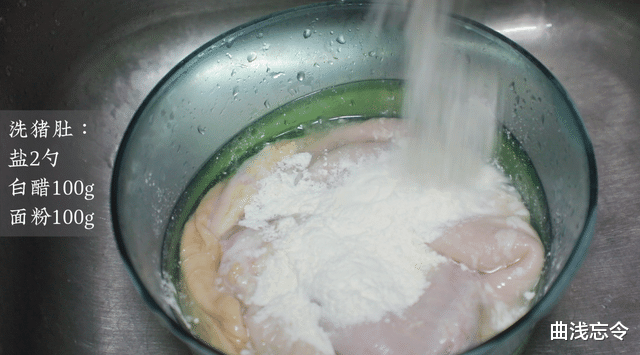 1.猪肚的清洗很重要,用盐、白醋和面粉主要是为了杀菌、去腥和去除黏液。要反复揉搓,面粉可以更好的吸附猪肚表面粘液和褶皱里的杂质,猪肚多余油脂要剪掉,切记猪肚要翻面,要把猪肚的里里外外都要清洗干净。可直接把它破开更好清洗。