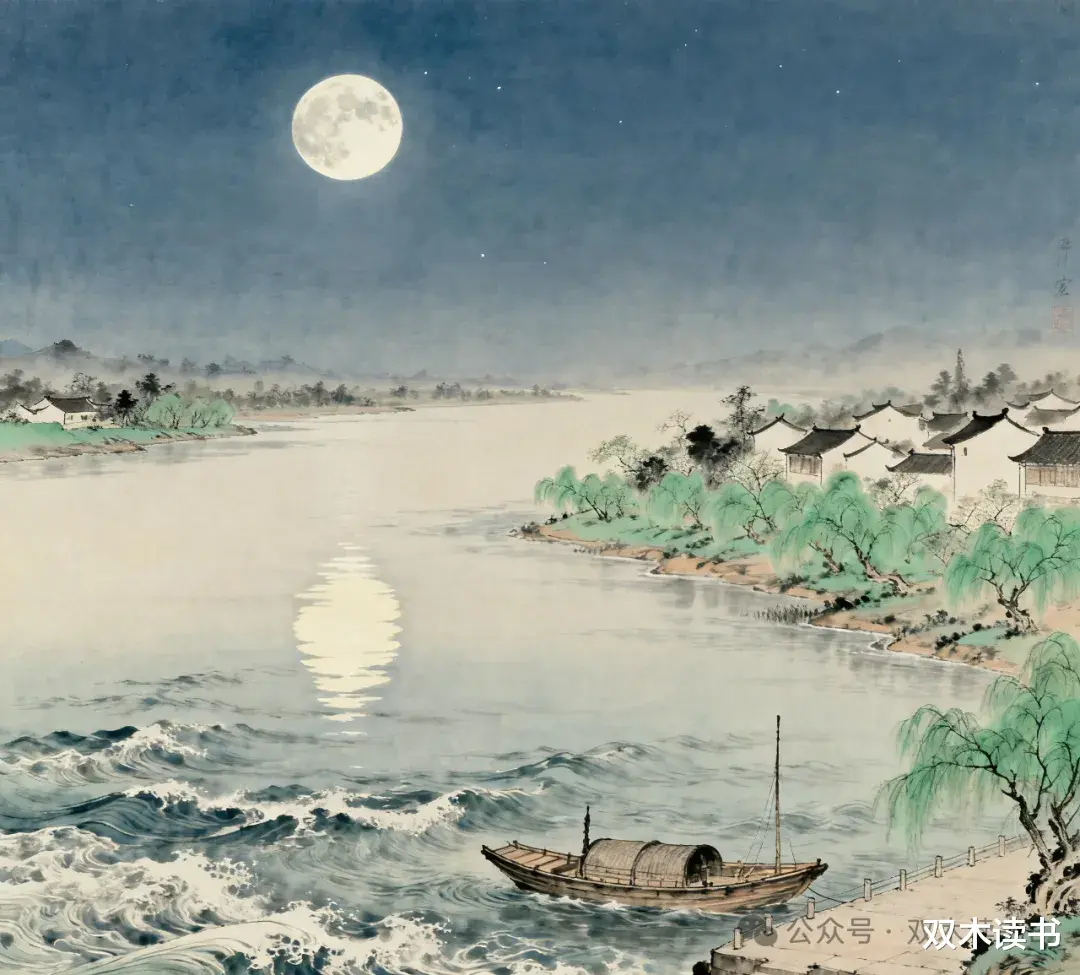 他放下笔,走到船边,看着江对岸的草色,突然发现:去年冬天还是枯黄的草地,现在已经泛出了淡淡的绿,风一吹,那绿色好像还在慢慢扩散。