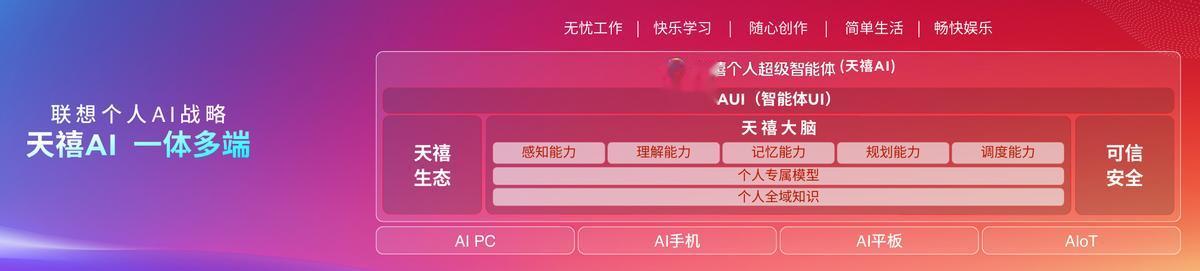 2025年“破界”之年:联想致力于打破设备操控的繁琐、打破人机交互的隔阂,推动智能体的发展,在AI时代“破界”而行。 作为联想“一体多端”战略的核心,一体即天禧个人超级智能体,简称“天禧AI”,它由AUI交互、天禧大脑、天禧生态、可信安全平台四大核心支柱构成。它不只是一个简单的软件,而是拥有感知、理解、记忆、规划、调度五大核心能力的智慧中枢,旨在成为最懂用户的个人AI。