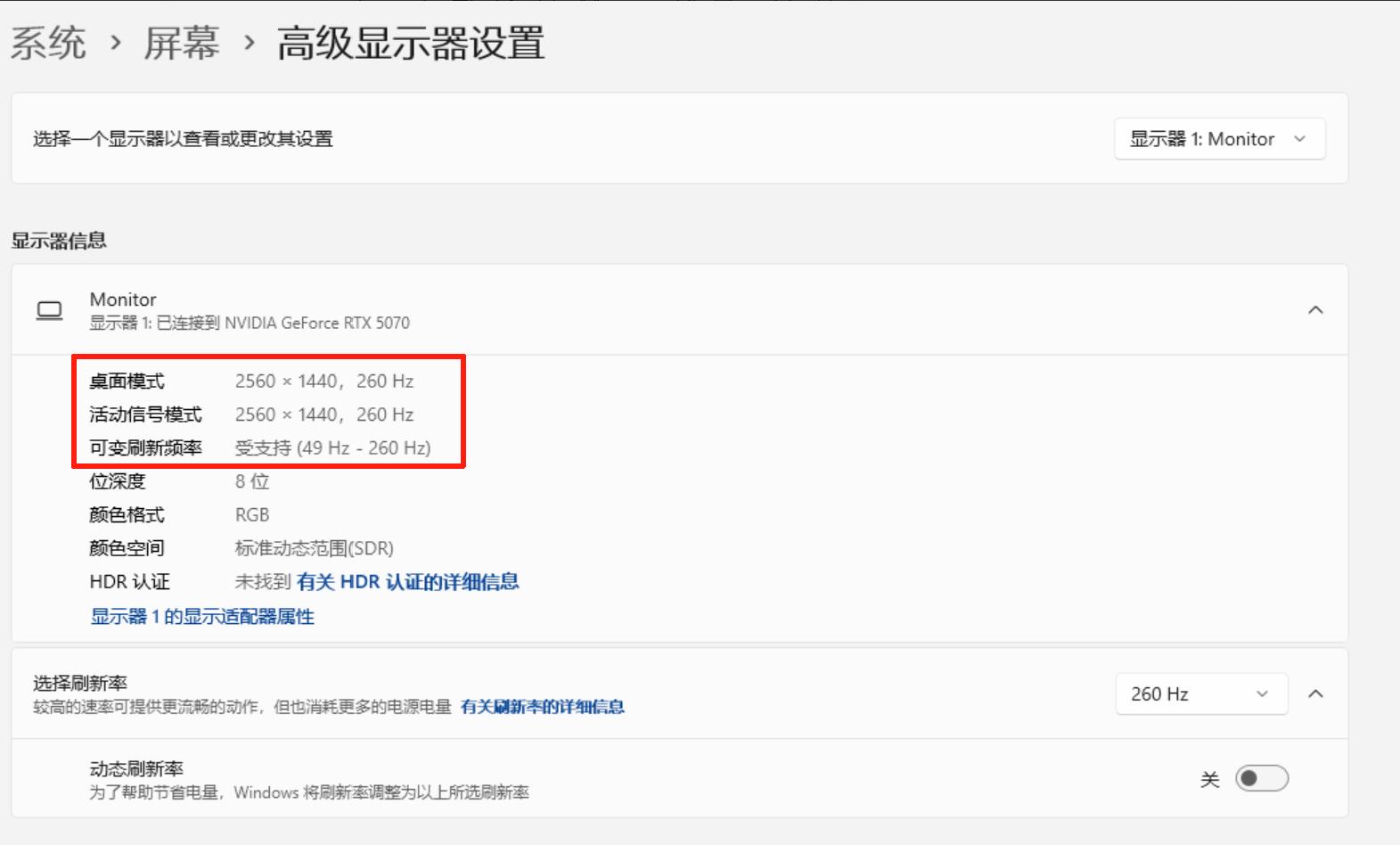 而我们通过MINI HDMI接口将EHOMEWEI Q1G Pro与PC 显卡连接,可以看到其可以在2K分辨率下达到260Hz的高刷新率,同时其支持49Hz到260Hz的VRR可变刷新率,在电脑端开启G-Sync或者FreeSync技术时可以有效防止画面撕裂,平时配合Mini PC或者笔记本电脑来玩游戏都是很不错的。