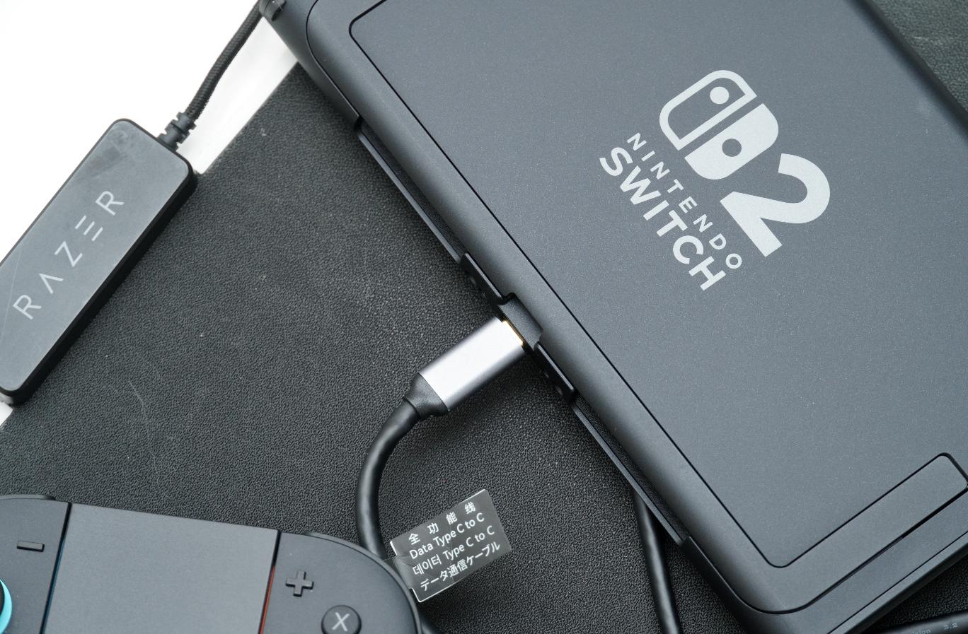 紧接着我们就来实测其一键直连Switch2的效果吧,我们要将Switch2的原装供电线或60W以上的PD供电线连接到EHOMEWEI Q1G Pro靠近mini HDMI接口的Type-C接口上,再通过EHOMEWEI Q1G Pro包装盒内带的全功能Type-C线与Switch2直连即可。