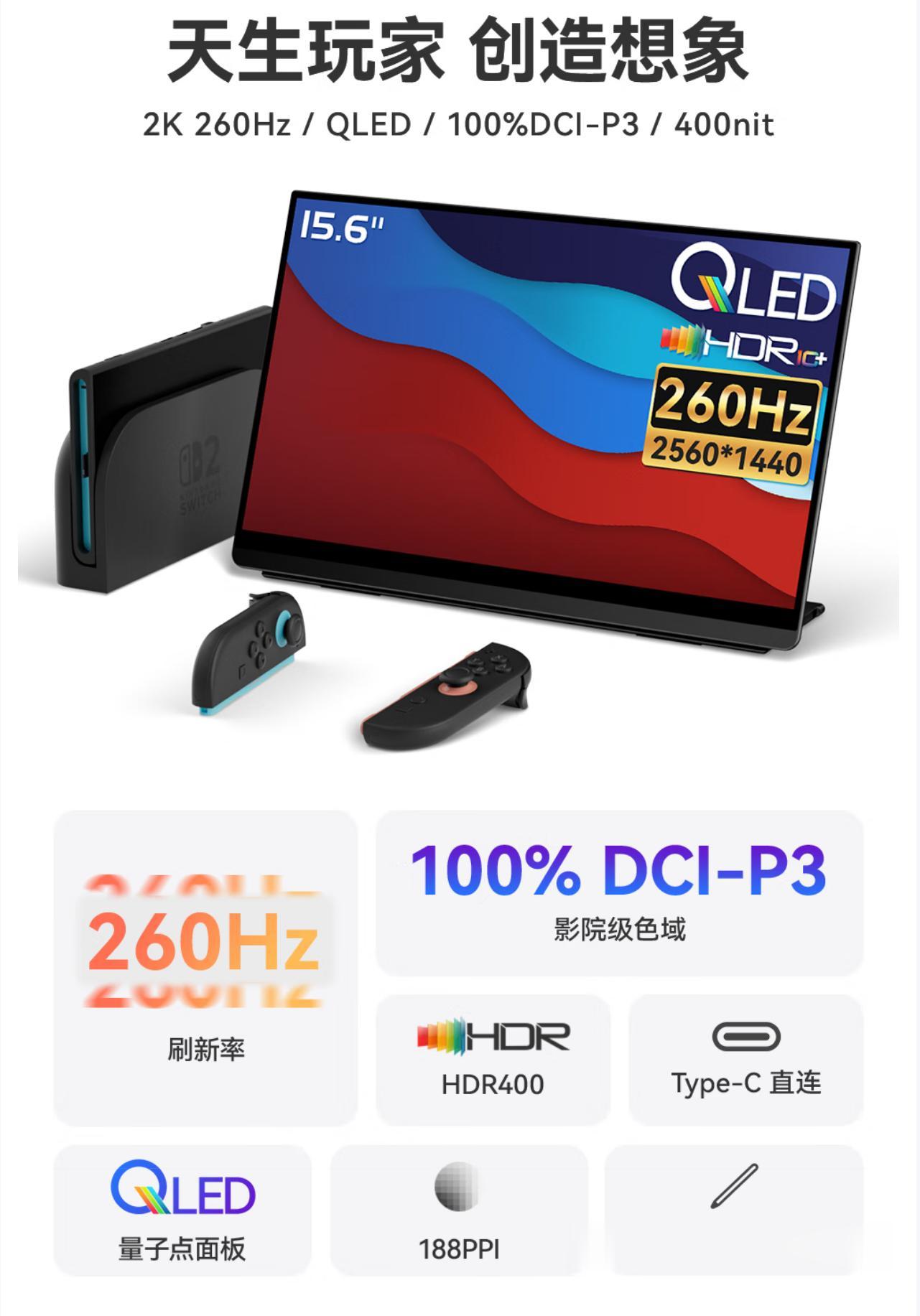 还是老规矩,通过官方图来了解一下EHOMEWEI Q1G Pro这款便携屏的参数,它是一款15.6英寸、2K(2560x1440)分辨率的便携屏,与多数同屏幕尺寸的游戏本的分辨率相同,均为188PPI,画面比较细腻,同时,它还有着260Hz的高刷新率,配合游戏本、Win掌机等设备则能发挥其超高的刷新率。另外,EHOMEWEI Q1G Pro采用了QLED量子点面板,拥有100% DCI-P3超高色域覆盖且获得了HDR400认证,无论是看电影还是玩游戏,也都有着非常不错的表现。