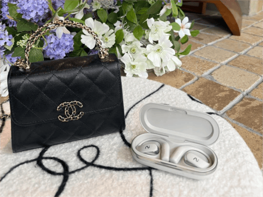 开放式蓝牙耳机哪款值得买,单耳约 5.1g,很轻,实际佩戴几乎无压感。标志性的 C 形桥结构让耳机在运动中也能稳固不掉。充电盒工艺细腻,外观类似织物质感但不容易沾灰,只是盒盖阻尼偏紧,单手开盖需要点技巧。