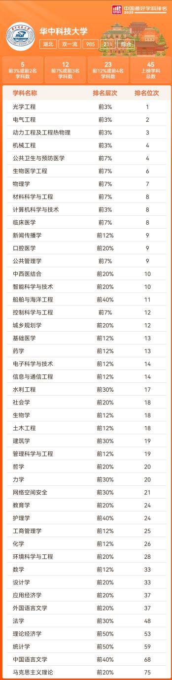 为了和当前中国高校在学科建设中对高水平学科的认知口径保持一致,软科将全国前3%(或前2名)作为“中国顶尖学科”的标准,华科大5个学科进入该行列,其中光学工程学科排名全国第1。