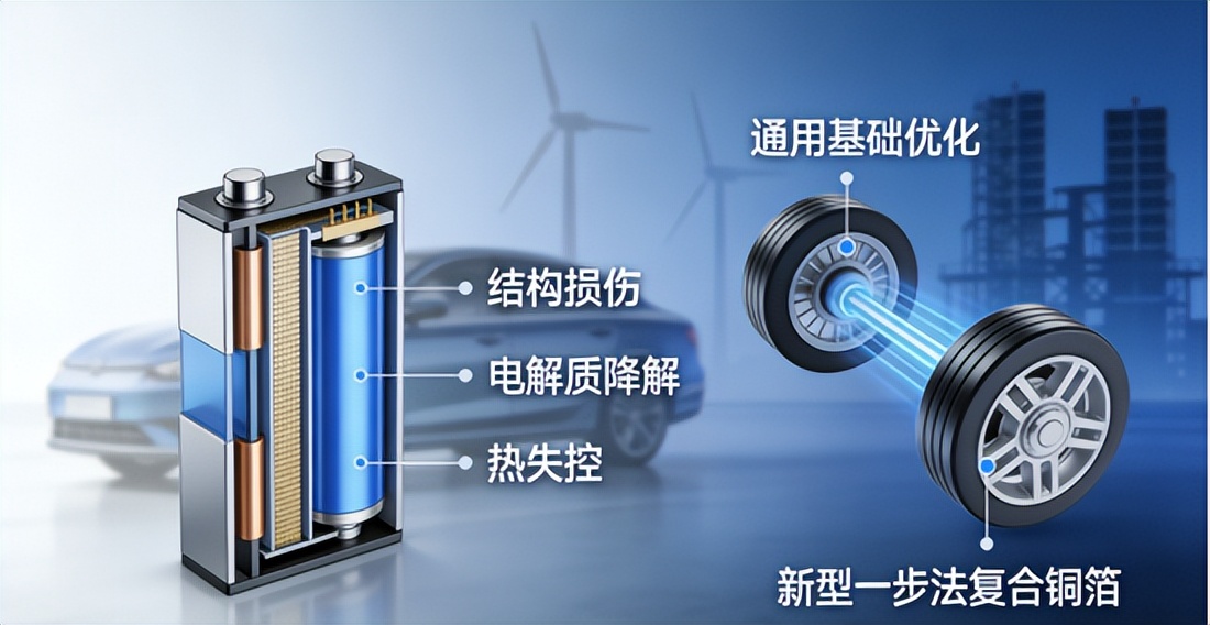 在通用基础优化的前提下,新型一步法复合铜箔作为集流体领域的核心材料创新,针对锂电池结构损伤、电解质降解、热失控三大核心痛点实现精准突破,同时兼顾能量密度提升,成为当前锂电材料升级的核心方向,与基础优化方向形成互补,实现1+1>2的优化效果。