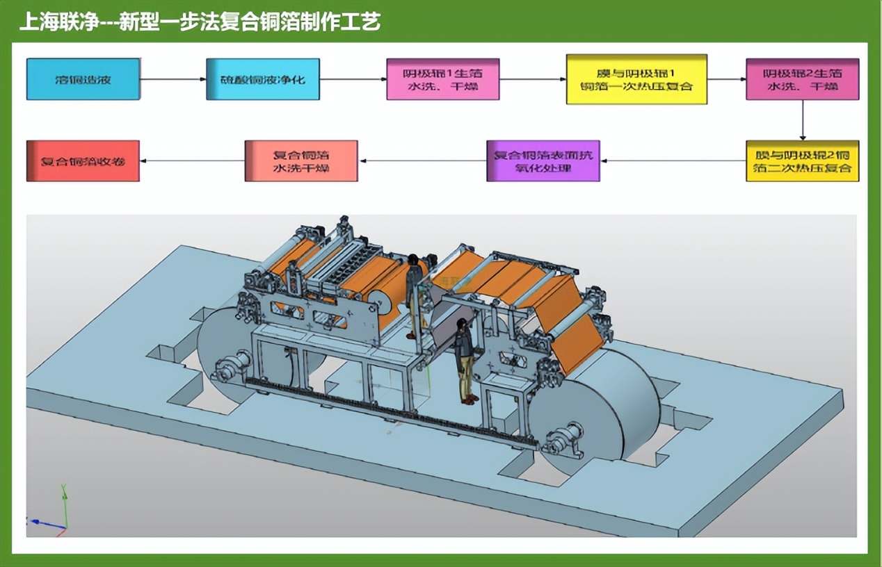 新型一步法复合铜箔工艺:一种高效、高质量、低成本、规模化生产的“新型一步法”复合铜箔制备技术,采用电解铜箔工艺+在线复合绝缘(PET/PP)基底,实现了一步法制备复合铜箔的创新突破,解决当前复合铜箔不能商业化量产的技术瓶颈。