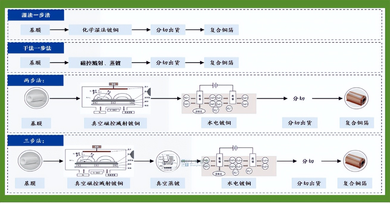 现有工艺:复合铜箔的主流生产方式包括一步法(一步干法、一步湿法)、两步法、三步法,其生产技术原理为真空磁控溅射、真空蒸镀、水电镀等传统绝缘高分子材料表面金属化技术的不同组合。