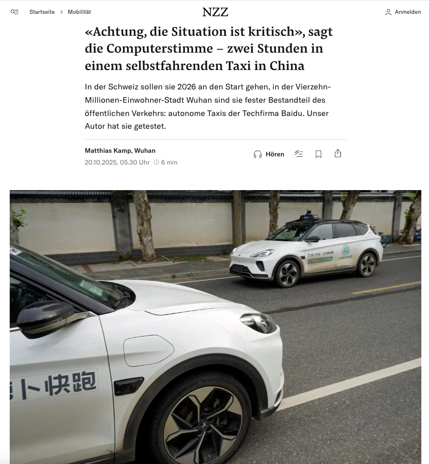 瑞士媒体《新苏黎世报》关于中国自动驾驶的报道,以萝卜快跑为主。