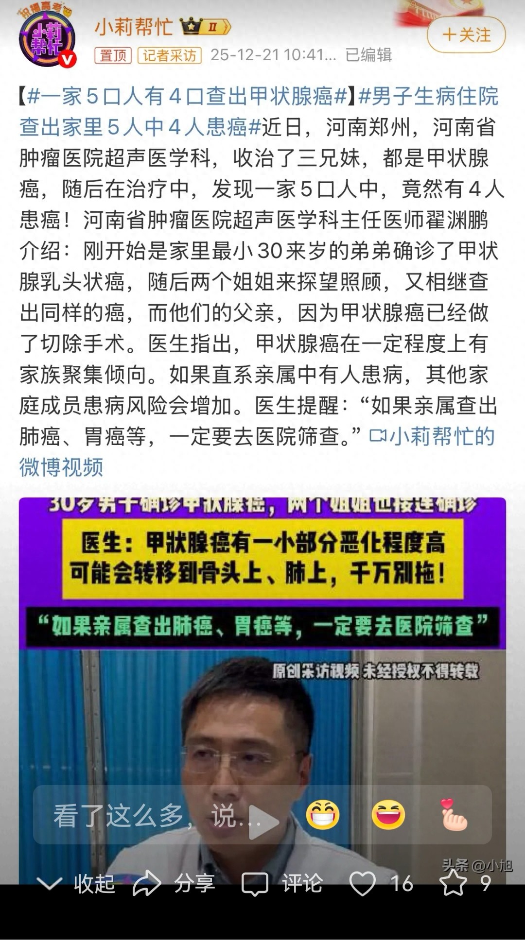 河南郑州,先是最小的弟弟确诊,两个姐姐去医院照顾他,顺便一查,结果也是。他们的父亲,之前已经因为这个病动过手术。医生说了,甲状腺癌确实容易“扎堆”出现在一家人里。直系亲属里如果有人得病,其他人真的要提高警惕。