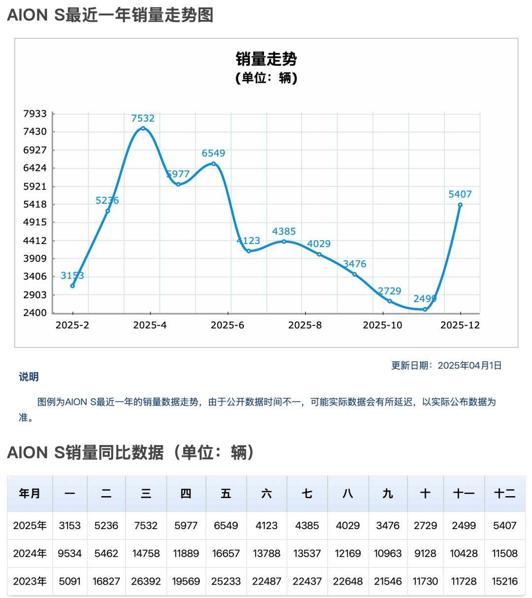 主要面向网约车市场的埃安AION S和埃安AION Y销量腰斩成为直接原因。公开数据显示,AION S在2024年还能销售14万辆,到了2025年只有5.5万辆,暴跌超60%;AION Y从2024年的15.6万辆跌到2025年的7.8万辆。