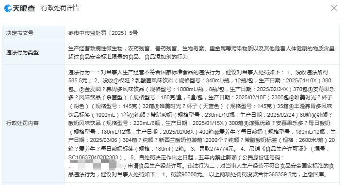 4月8日,枣庄新盛食品有限公司因生产经营“新西兰酸奶”“爱养牛每日酸奶”“安慕果乐多”等多个不符合国家食品标准的食品,被枣庄市市中区市场监管局吊销食品生产许可证,法定代表人郭某五年内禁止申请食品生产经营许可,合计罚没365359.5元。5月9日,该公司因“其他违反食品安全、行政法规规定、严重危害人民群众身体健康和生命安全的违法行为”,被市场监管部门列入严重违法失信企业名单。