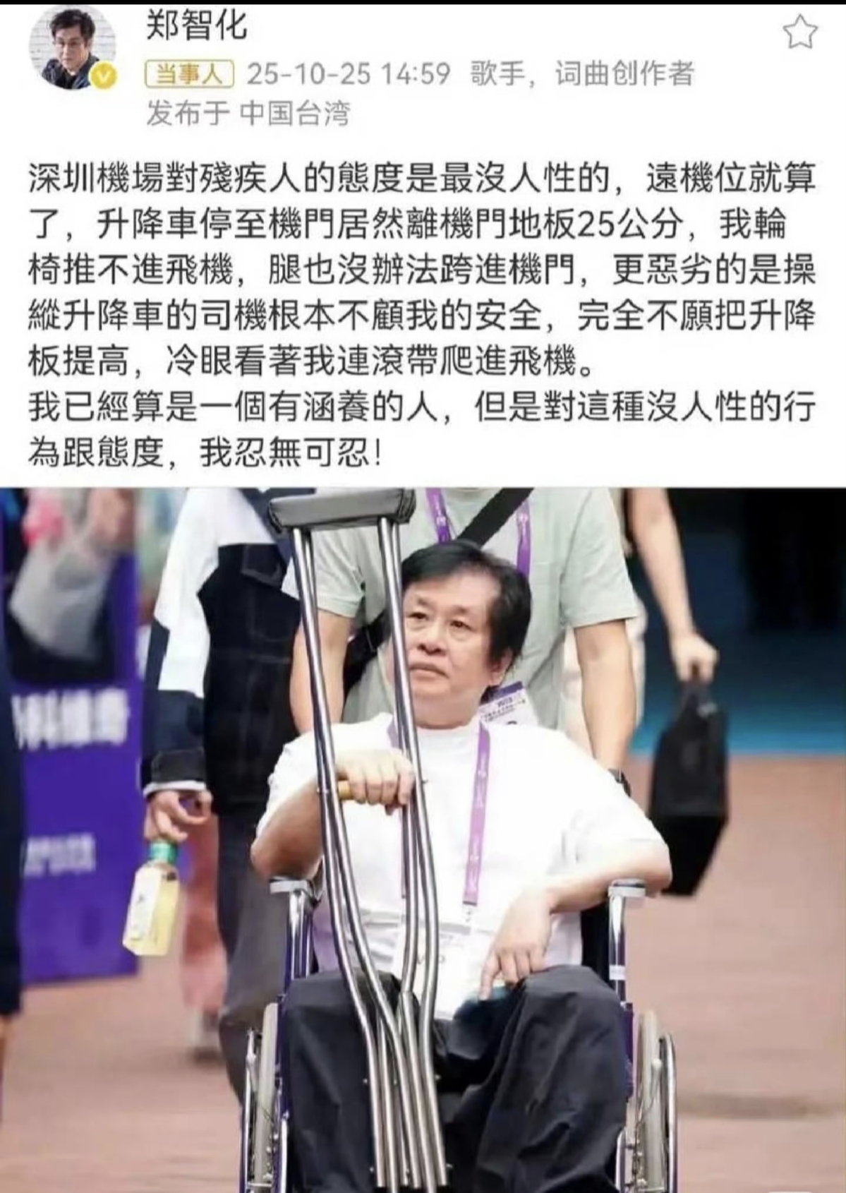 10月25日,郑智化老师从深圳飞台北,结果升降车离机门地板25公分,轮椅根本推不进去!司机大哥淡定围观,郑老师只能“连滚带爬”进飞机,这画面光想想就心疼又好笑。他发文吐槽:“深圳机场对残疾人的态度最没人性!”直接引爆全网热议。