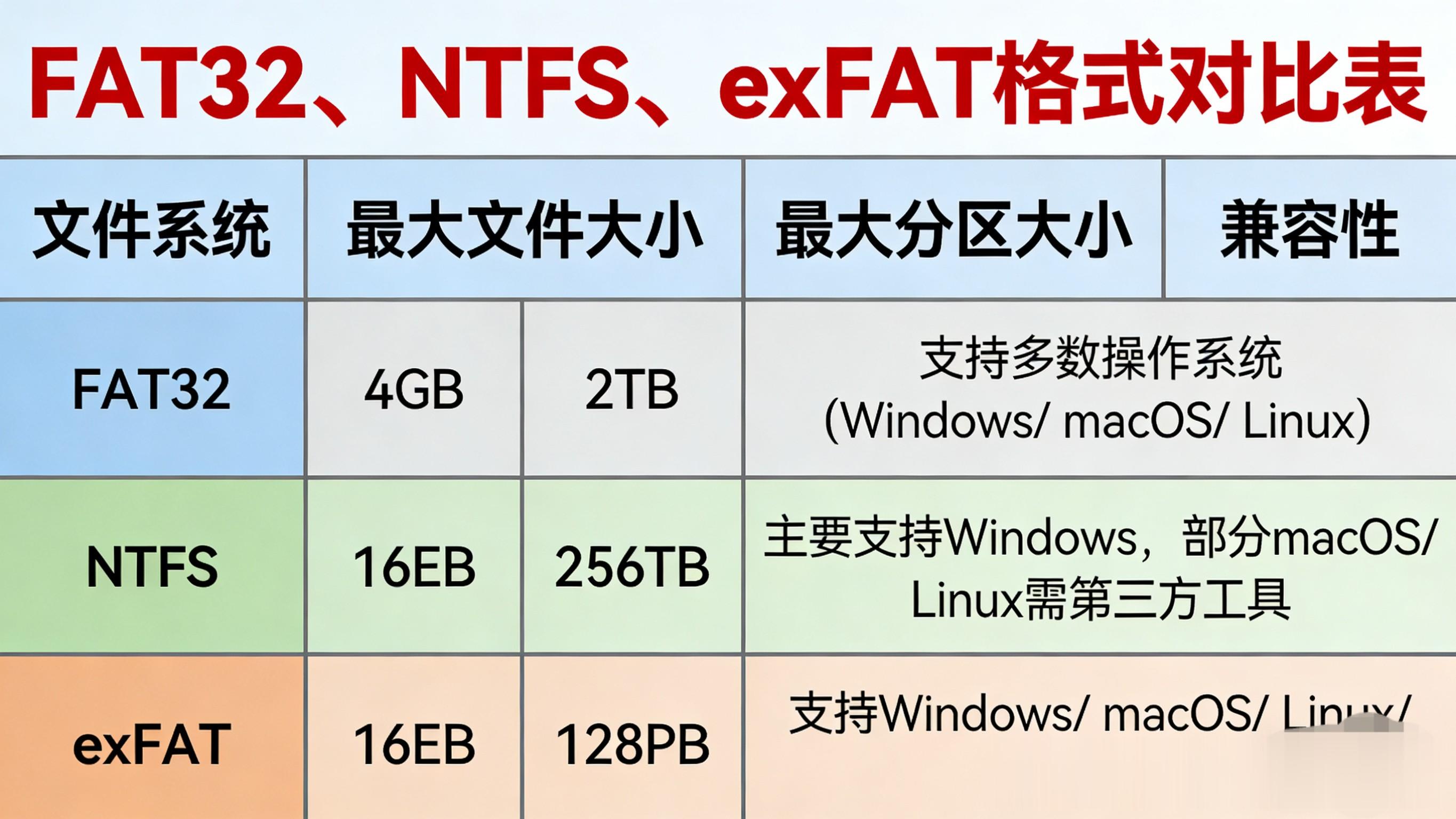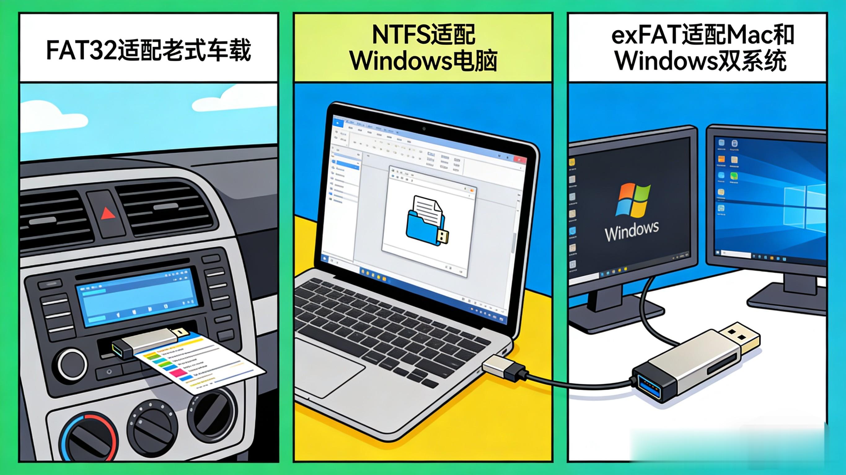 老设备小文件选FAT32,Windows专用选NTFS,跨平台新设备闭眼选exFAT。