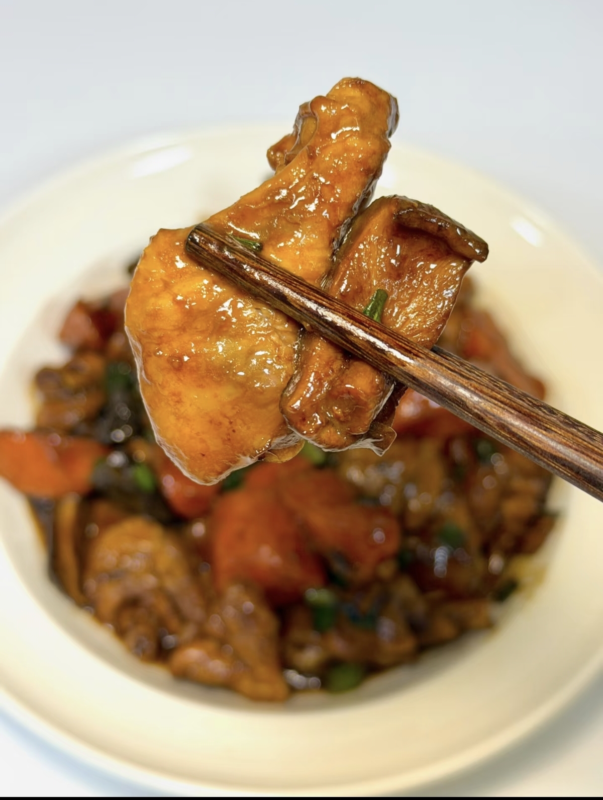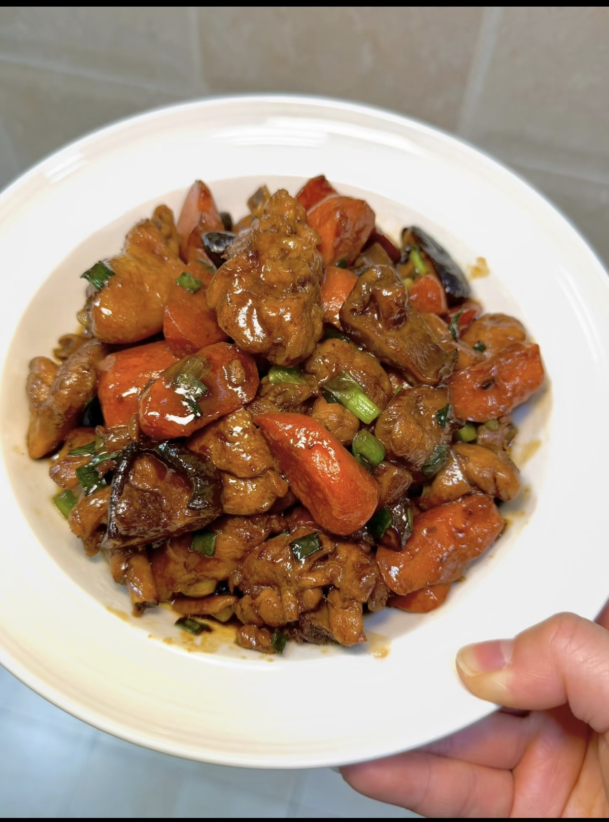 盛出一盘香菇烧鸡,鸡肉嫩滑不柴,轻轻一夹就能骨肉分离;香菇肥厚多汁,咬下去满口鲜醇;汤汁浓稠红亮,拌着米饭吃,每一粒米都裹着咸香的酱汁,简直是下饭神器。这道菜的魅力,从不在技巧的繁复,而在那份用心烹饪的温暖。从焯水去腥到爆香翻炒,从焖煮入味到收汁出锅,每一步都藏着对生活的热爱,出锅时的香气,便是对这份心意最好的回应。