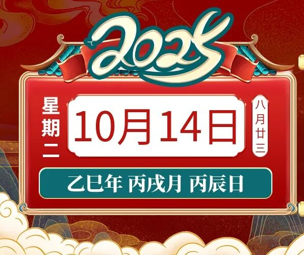 2025年10月14日,星期二,农历八月廿三 (乙巳年丙戌月丙辰日),法定工作日。