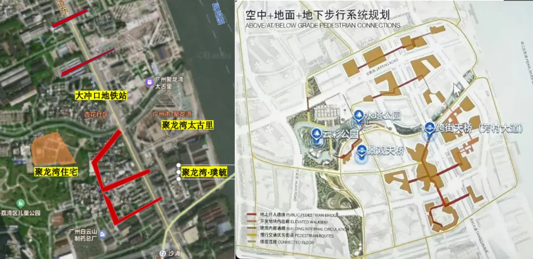 这个立体慢行系统,目前大湾区只有深圳湾有,分为地面,地上,地下3层,串联轨道交通,车流,和人流,拉通商业,在广州,聚龙湾将是首创。