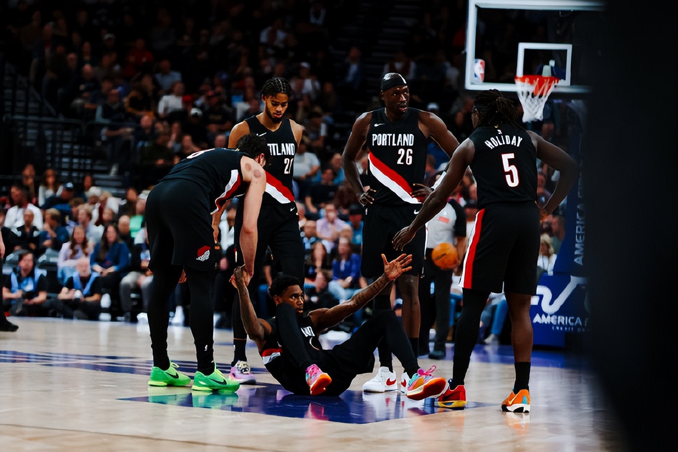 夏普稳定发挥,出场24分,14投6中,三分球8中4,得到18分4篮板。格兰特替补出场25分钟,12投4中,三分球7中3,得到18分3篮板2抢断,但正负值-10。卡马拉首发出场31分钟,14投6中是,罚球8中3,得到17分4篮板5助攻2抢断,也有2次失误。