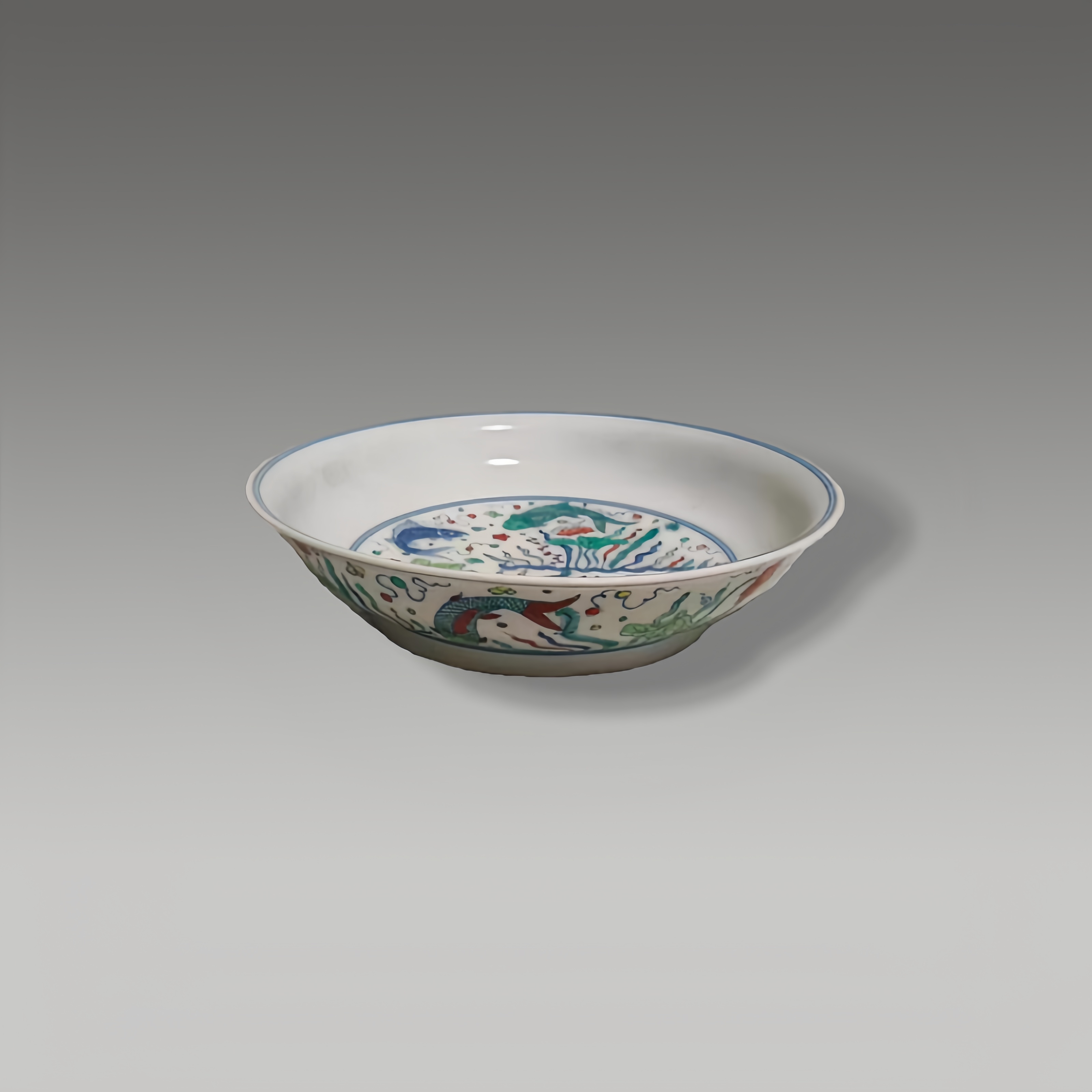 盘心与盘壁满绘鱼藻纹,五条色彩各异的锦鲤穿梭于水藻、莲花之间,寓意 “年年有余”“富贵吉祥”