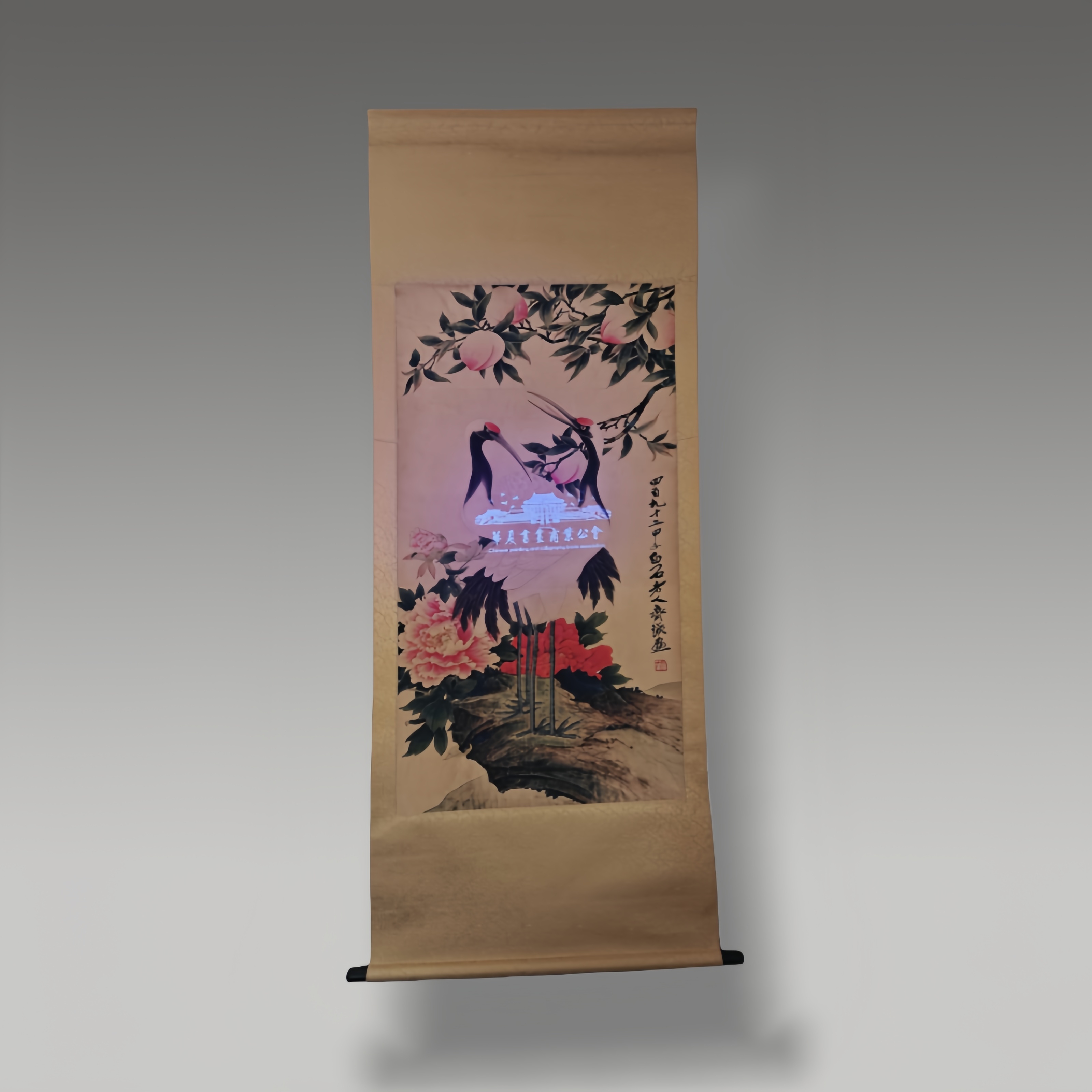 这幅画设色雅致,仙鹤灵动,牡丹与寿桃相映成趣,笔墨间透着祥瑞之气,既有传统工笔的细腻