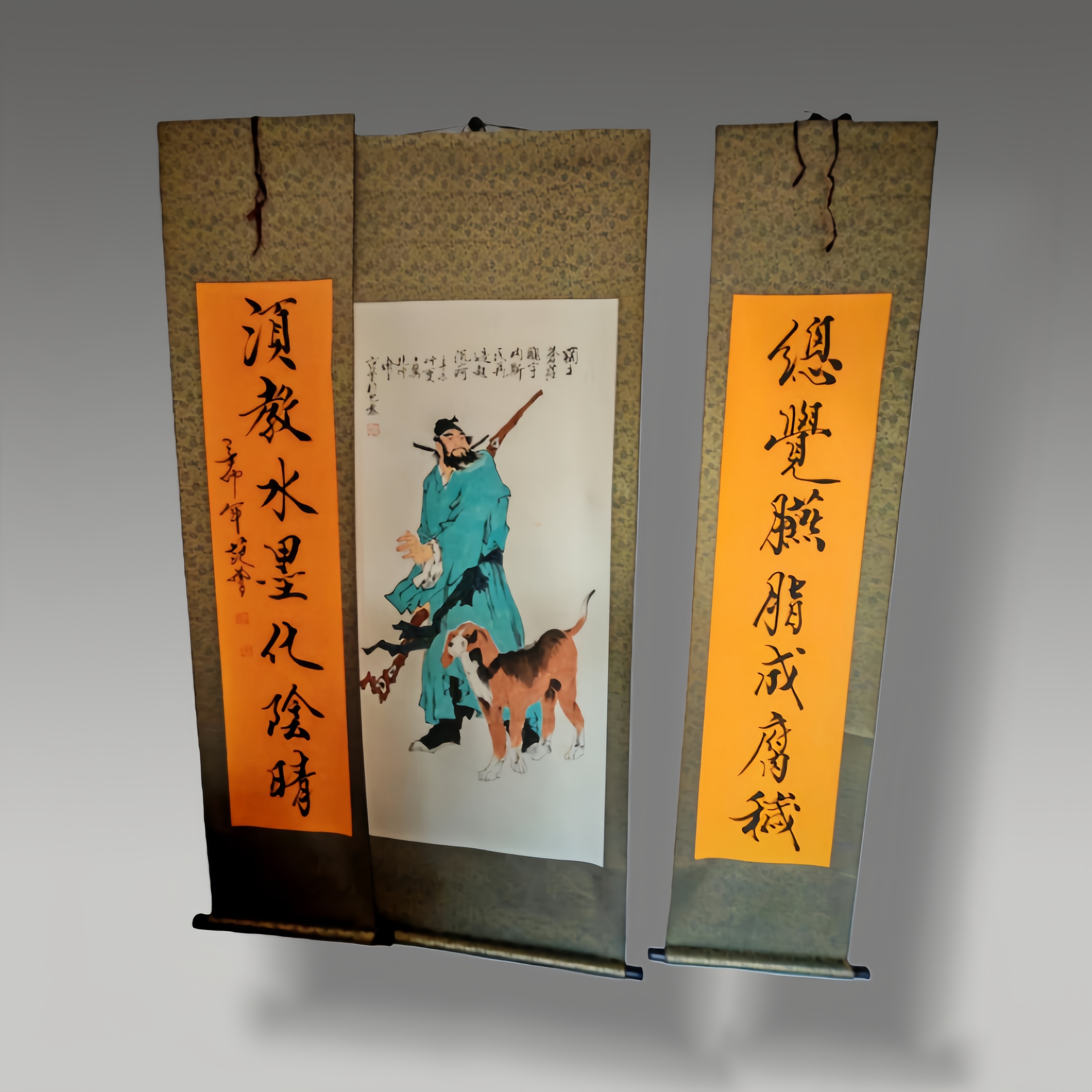 这幅画与对联相得益彰,人物形神兼备,墨色灵动雅致,书法笔力遒劲,整体雅俗共赏,尽显传统艺术的精妙韵味