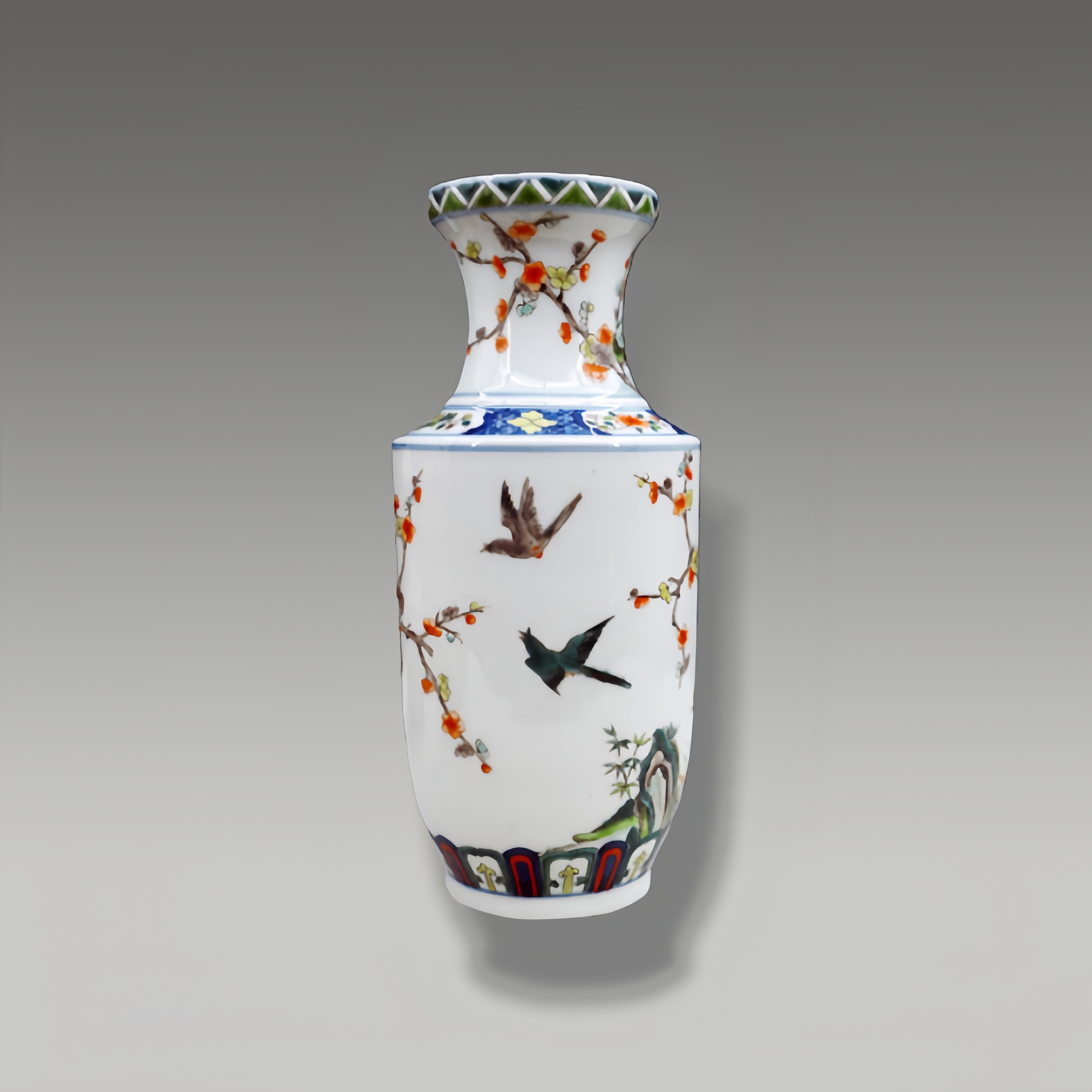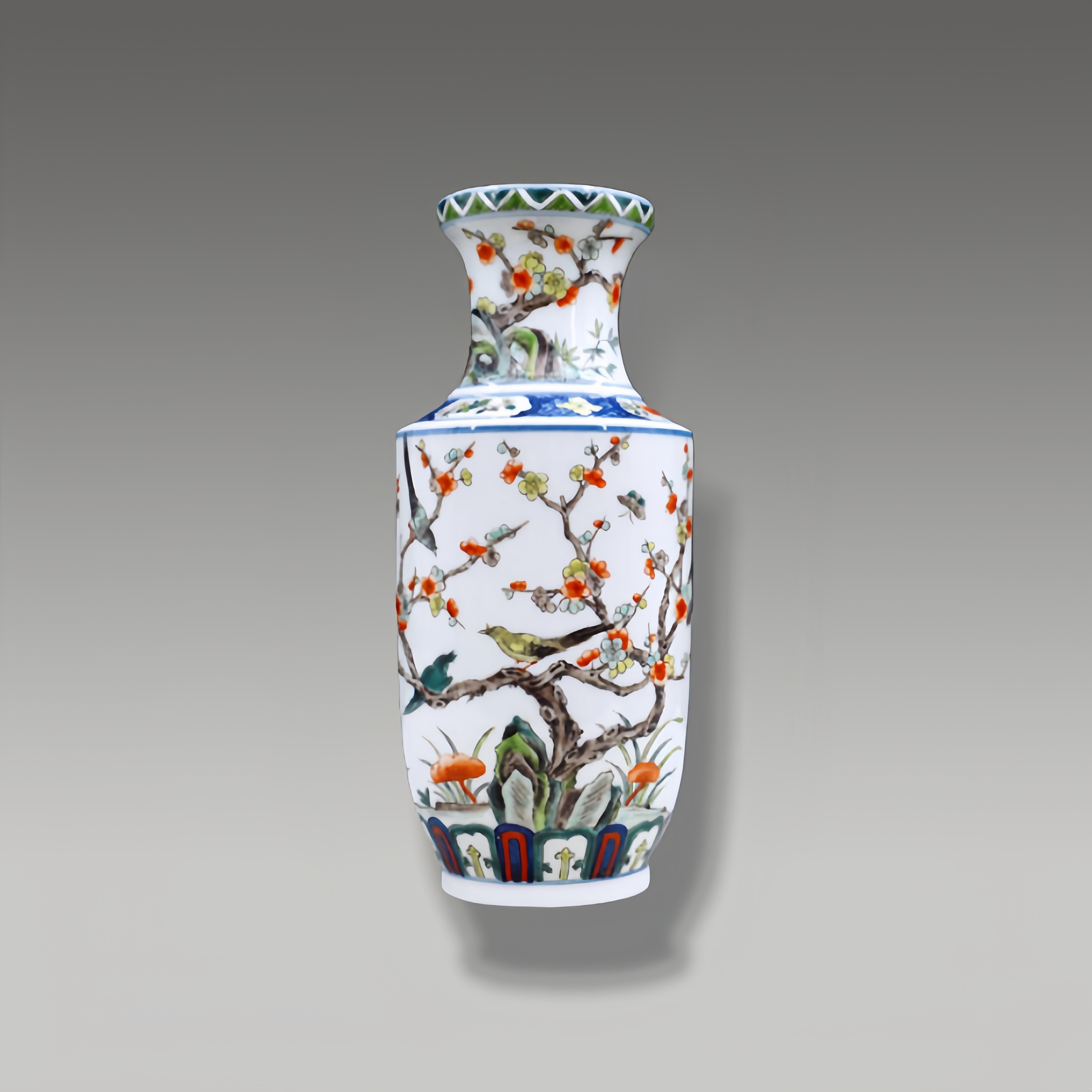 器型挺拔规整,青花纹饰与五彩相融,梅枝虬曲苍劲,花鸟灵动如生,尽显五彩瓷绘的精工与审美意趣