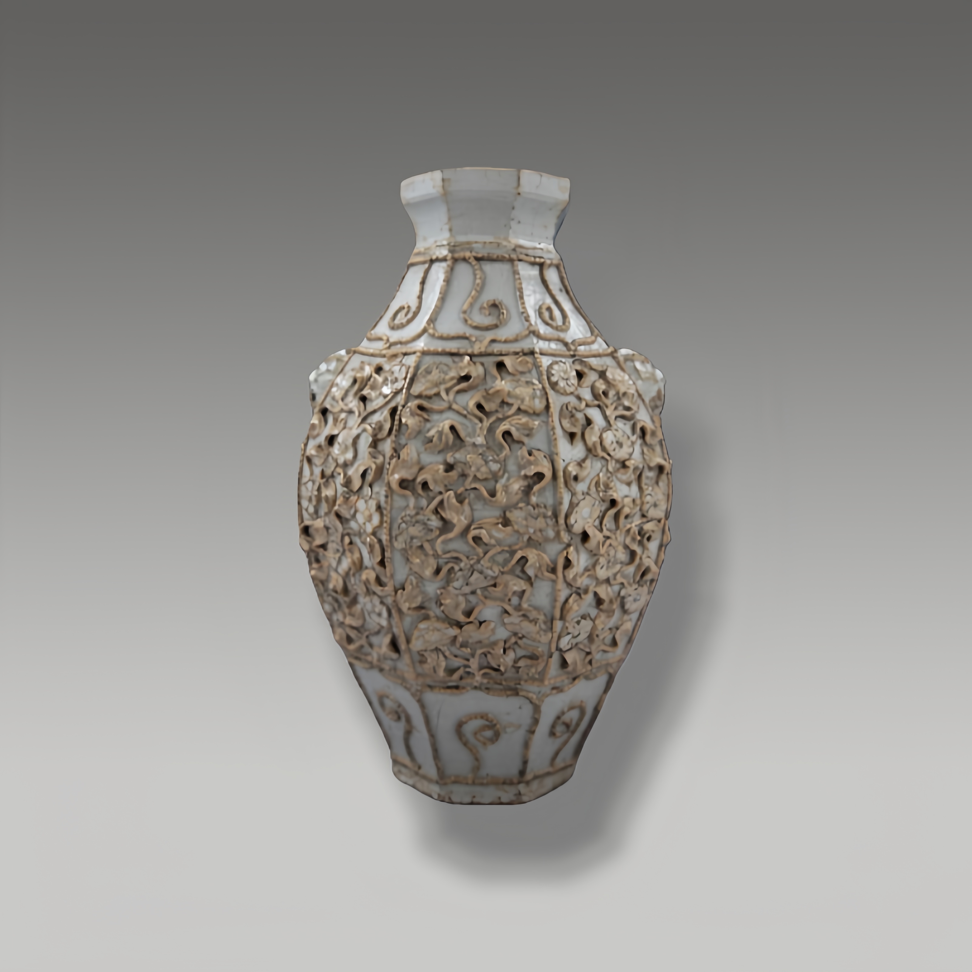 胎质细腻,青白釉色温润似玉。瓶身贴塑纹饰繁复却层次分明,尽显瓷工艺的精湛与匠心之巧